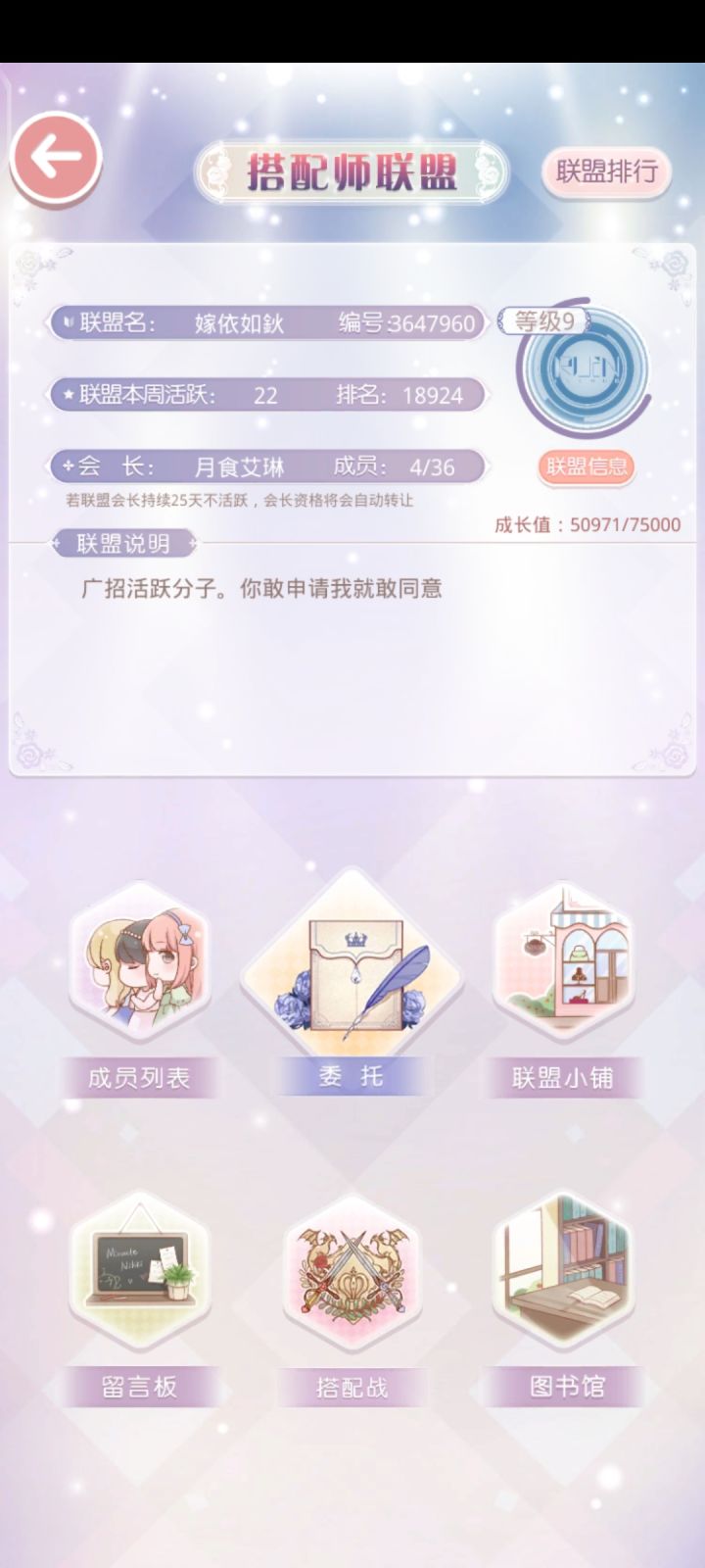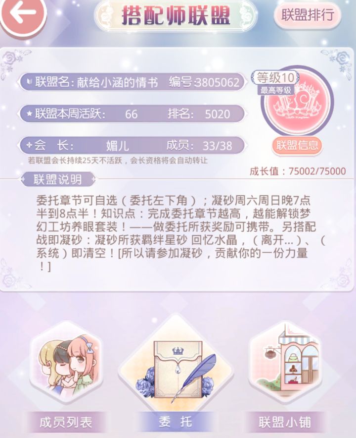 建此盟者,不知何友也,我初入盟,近月余,会长“只为你”暂退,点副会长我和星尘,彼时六级,现已满级矣!系统会长已换;盟中、副会长小丫贡献良多;友友此间有暂退的,也有新加入的,经过努力,凝砂装现已做完一套,正做镜花拂云!其余皆散件也。将近寒假,衷心的雀跃欢迎友友加入或者归来!(欣有来友,不负其所托之意也)!联盟:献给小涵的情书:3805062(十级)欢迎你!