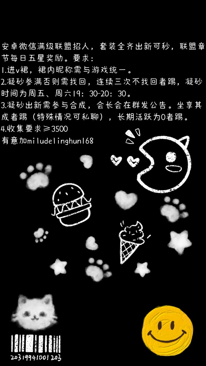 安卓q区招人(*/ω\*)联盟名:兔兔之盟编号:3357376章节进度:22凝砂套装:前五套(第六套快完了)凝砂时间:周五六19:30-20:30要求:周五六凝砂能来,没有其他要求(有事可以请假),有人陪组队,不用担心缺人(可以加群哦,社恐也不用担心啦,一般群里不聊天(也可以收进群助手),只是用来每周凝砂通知的,当然你是热爱聊天的宝子也欢迎来暖群(我们就缺这样的)(ノ∇︎〃 )p