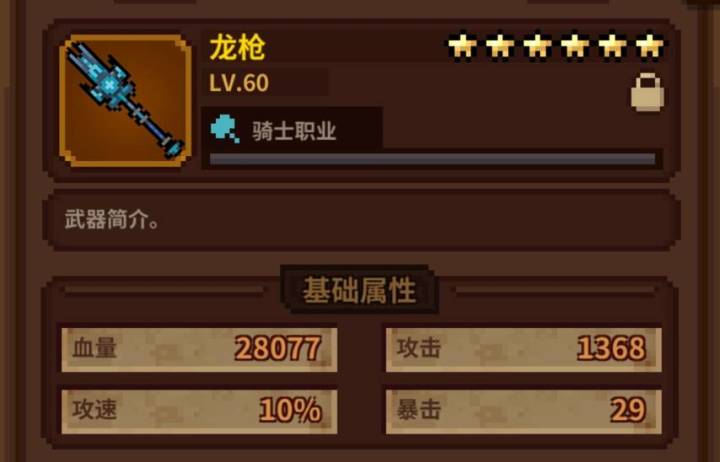 前言:不进行武器具体评价,各位自行选用骑士:法师:牧师:弓手:剑士:6星武器属性(橙色):攻击属性:暴击(86-90),攻击174,攻速15%生存属性:闪避(86-90),生命13500,防御135抗性属性:水,火,土,风,暗,光 15
