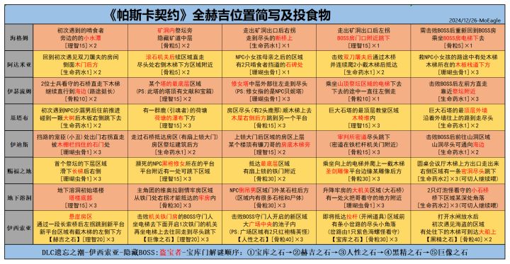 图片看不清?点击图片,下载原图,到手机相册看!图表主要作用:看投喂物,位置是简写关键字眼已标红,方便快速确认目标最下方补充一些赫吉相关的攻略链接↓↓↓破碎石板(维奥拉契约物)获取地点BV1zC4y1W7r3↓↓↓本体各章节全赫吉位置BV1JE411x7jT↓↓↓DLC遗忘之潮全赫吉位置BV1yp4y1v7rg(自行复制BV……至币站看,因为taptap显示此贴含其他网站网址,不