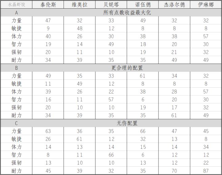 加点完全按照之前的思路研究这并不是修改了之前的方案,而是新增了第6位角色「伊琳娜」,也是真正意义上的全角色方案感谢提供伊琳娜的加点数据,感谢把伊琳娜领回家,感谢每一个热爱游戏的玩家做了表格方便大家传阅
