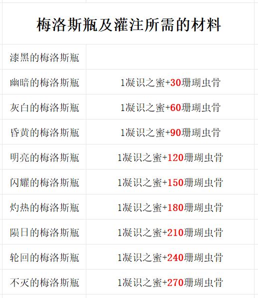 获得不灭的梅洛斯瓶在【基塔布】[掘基人]处获待[梅洛斯瓶],并成功完成9次[灌注梅洛斯瓶]•灌注梅洛斯瓶和所需材料漆黑的梅洛斯瓶①幽略的梅洛斯瓶,1凝识之蜜+30珊瑚虫骨②灰白的梅洛斯瓶,1凝识之蜜+60珊瑚虫骨③昏黄的梅洛斯瓶,1凝识之蜜+90珊瑚虫骨④明亮的梅洛斯瓶,1凝识之蜜+120珊瑚虫骨⑤闪耀的梅洛斯瓶,1凝识之蜜+150珊瑚虫骨⑥灼热的梅洛斯瓶,1凝识之蜜+180珊瑚