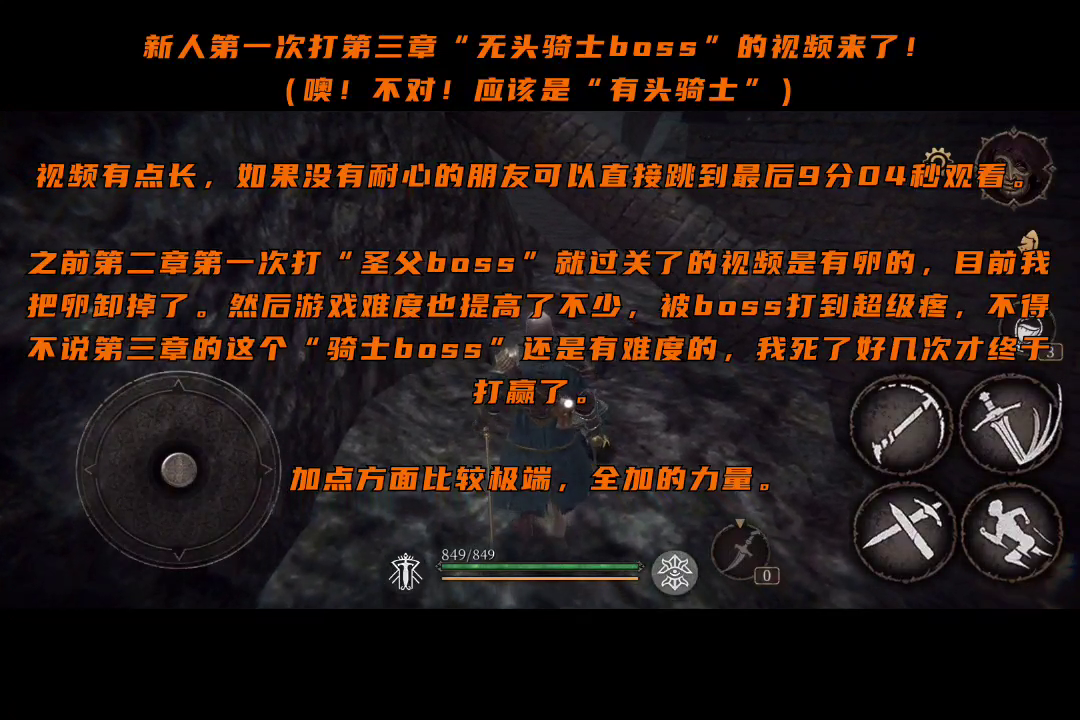 当新人第一次打第三章“骑士boss”正常模式,无卵,属性全加的力量,赐福等级20。死了好几次,终于在第六次挑战的时候成功了,最后发现居然一分钟之内打赢了。