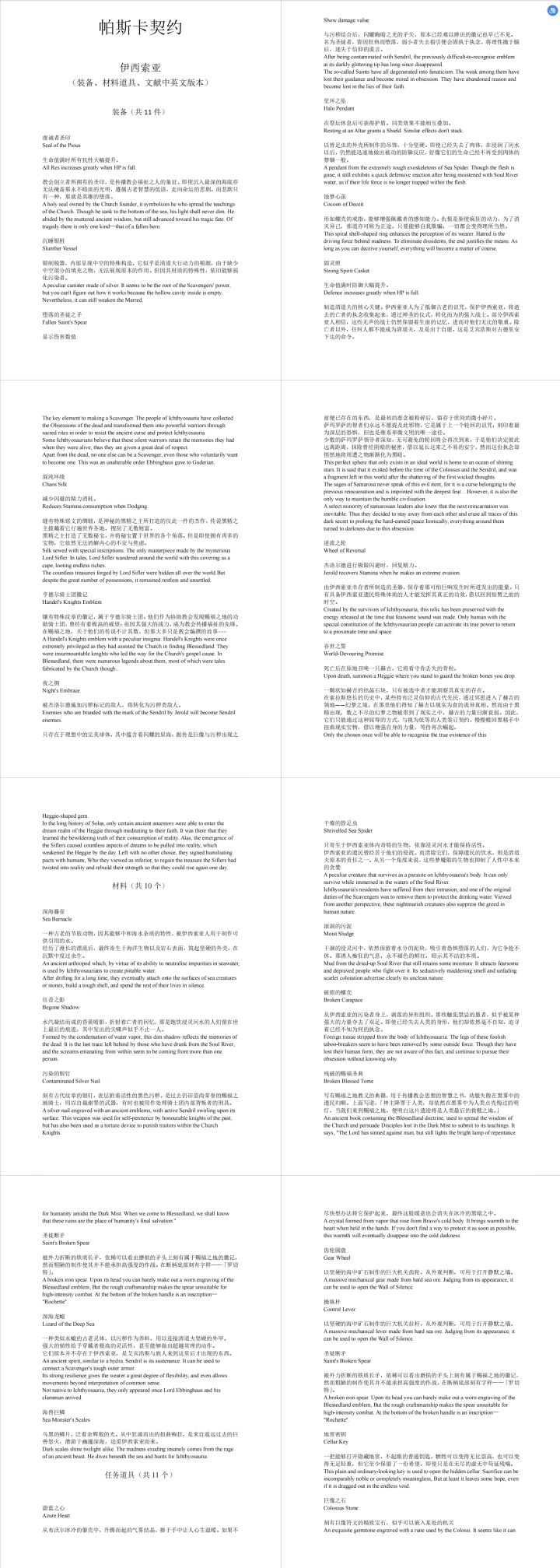 帖子图片更新了,可以看这里,细节可查看评论区。分成了三楼:装备、材料道具、文献有需要的话,大家自取吧本来想发文档的,可惜了。做得不好的或者是有纰漏的地方,还请及时指正|ω・)篇幅过长,请先驱者做好准备。