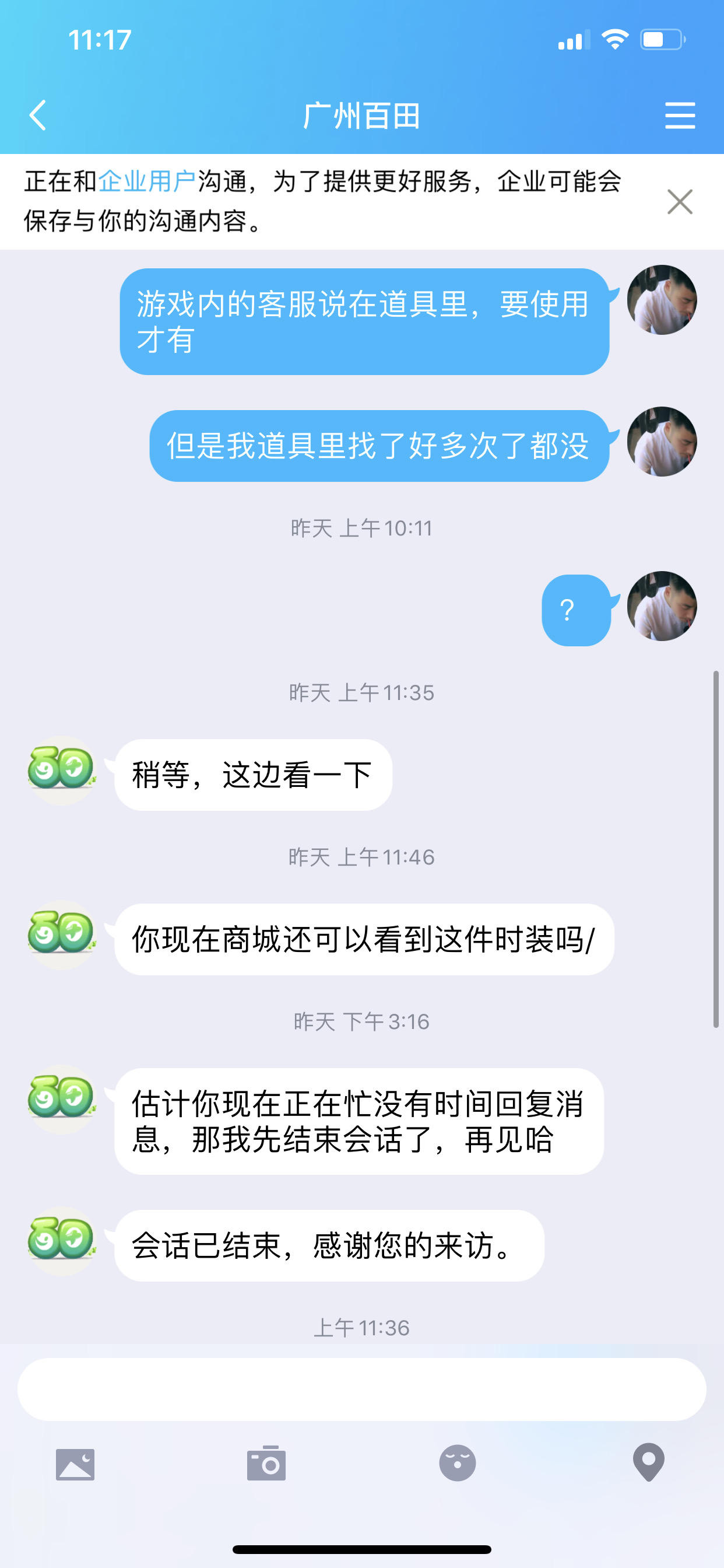 我买了个主角的什么伯爵的时装,然后当时提示我要穿吗我点错点了个不穿,然后就不见啦!!问客服说背包里使用,但是背包里完全找不到、加QQ客服也是问一句1个多小时后才回,然后我忘记了再进QQ的时候客服把我关闭对话了。。我又重新问,早上问的现在还没回我。。对了商城也找不到时装,已经购买了,进队伍里主角的时装里也没有,说明没有使用。。我买了已经快5天了。。