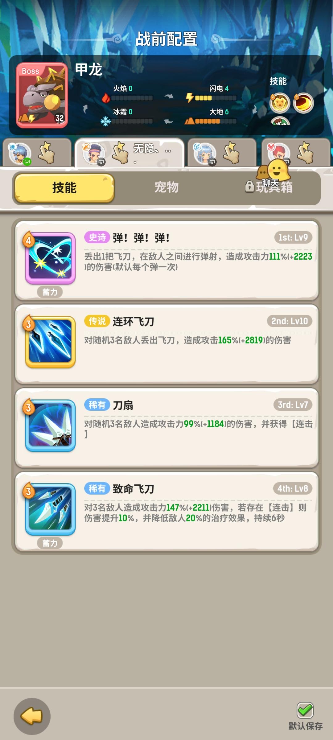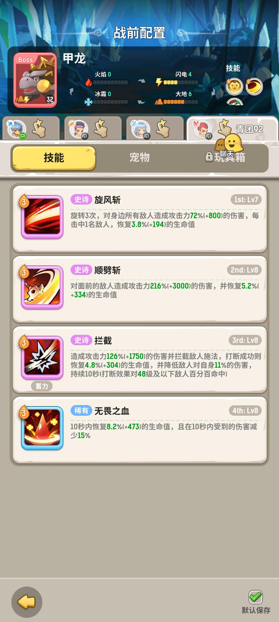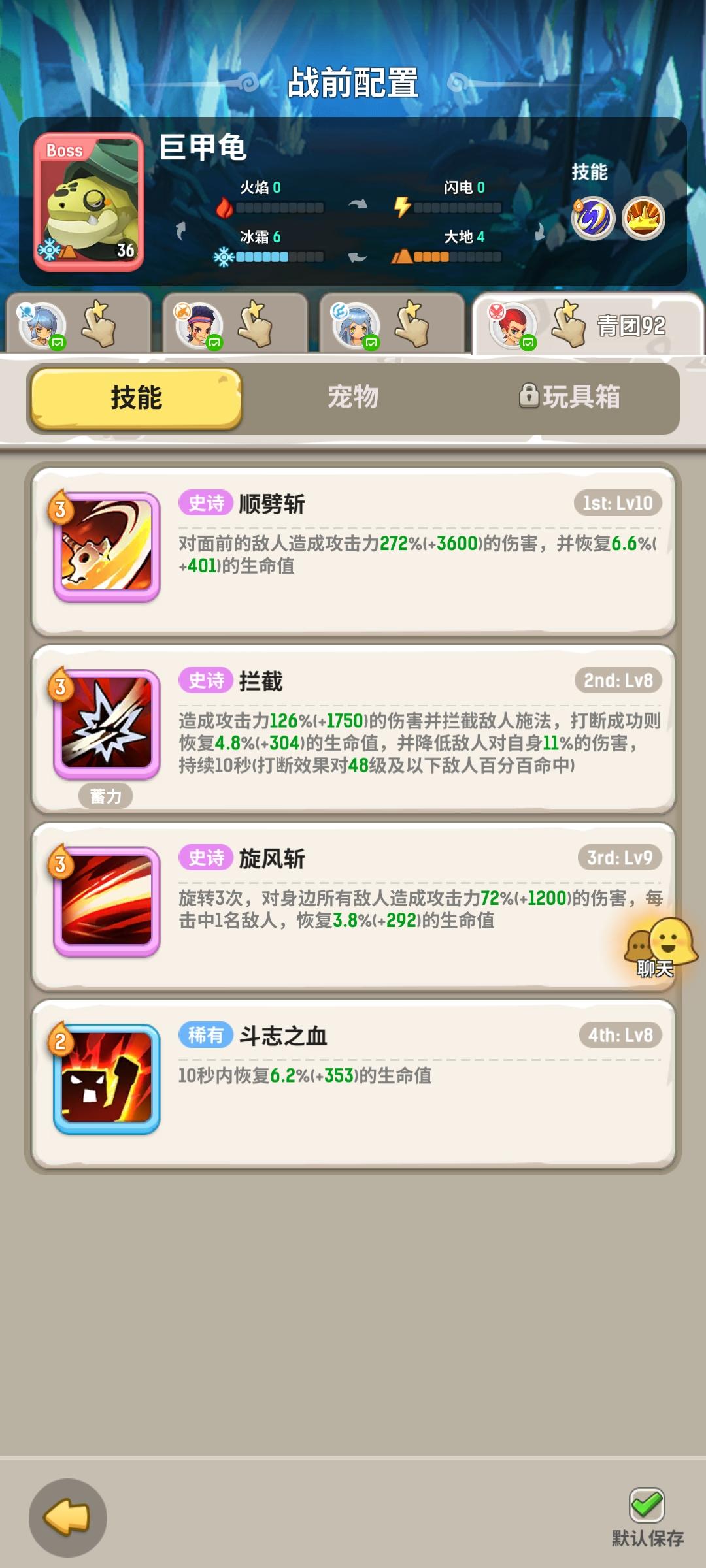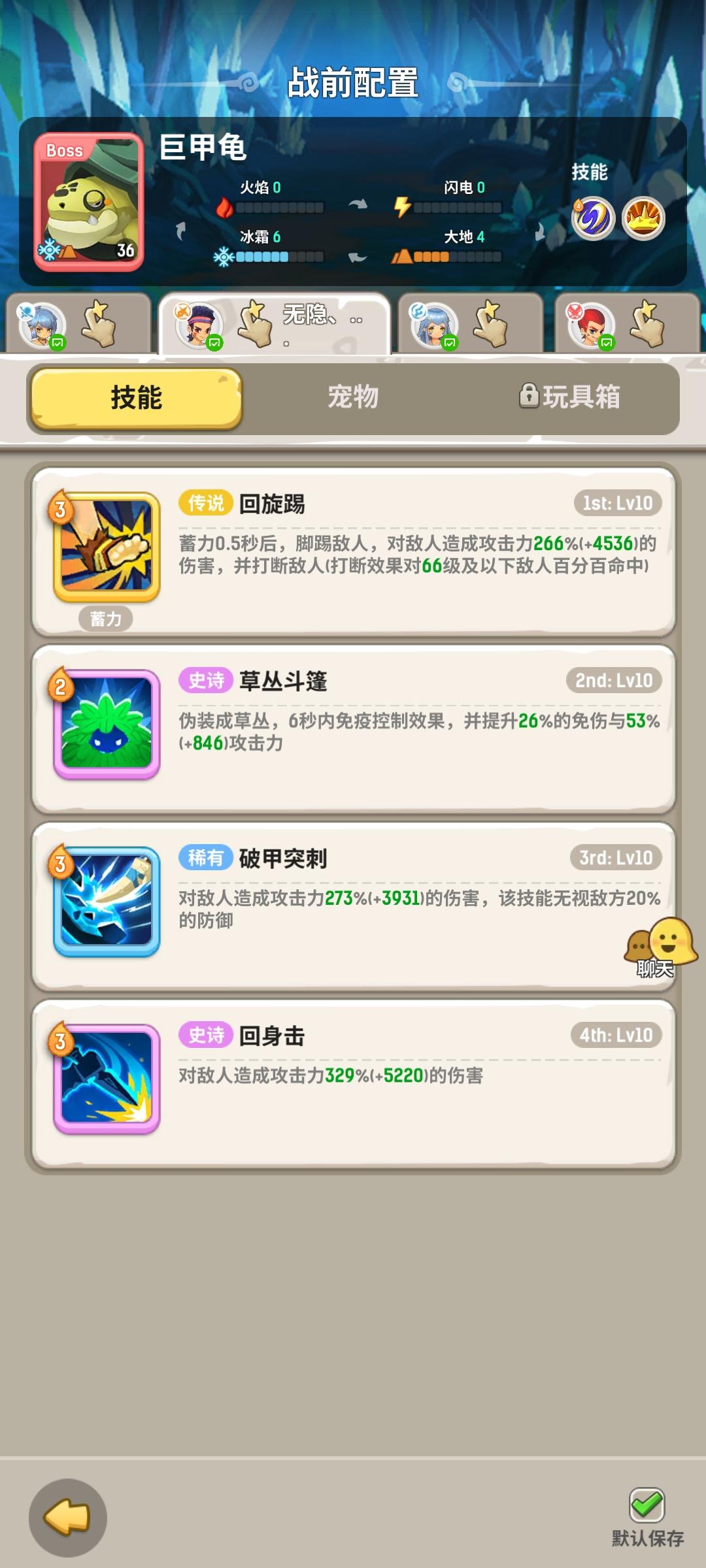 新的一关新的开始最近有很多小伙伴要我们的挂机技能配置,这套我们在东北海岸8都是满经验,现在我就呈上:现在发我们队伍进东北海岸的属性图进入正题刺客已经变身,其他三个没有变雷电盾皮鱼1-7战 狮子吼(土),重拳击飞(骆),作战动员(鲸),坚定(鹿)术 生命分流(虎),灵魂印记(猪),暴力蛙(土),大眼蛙(熊)刺 ,荼毒(猪),回身击up(虎),毒刃(土),草丛斗篷(熊)萨 生命图腾(