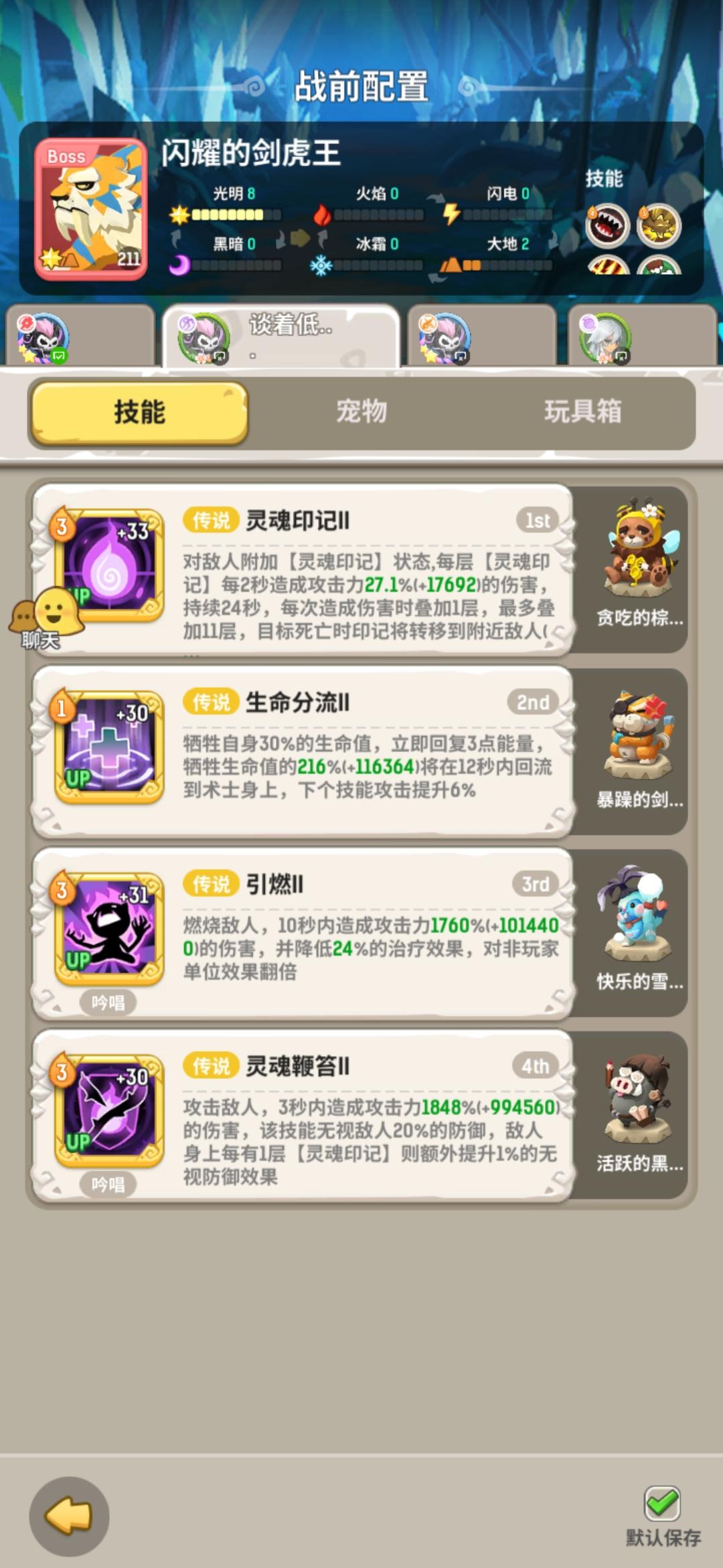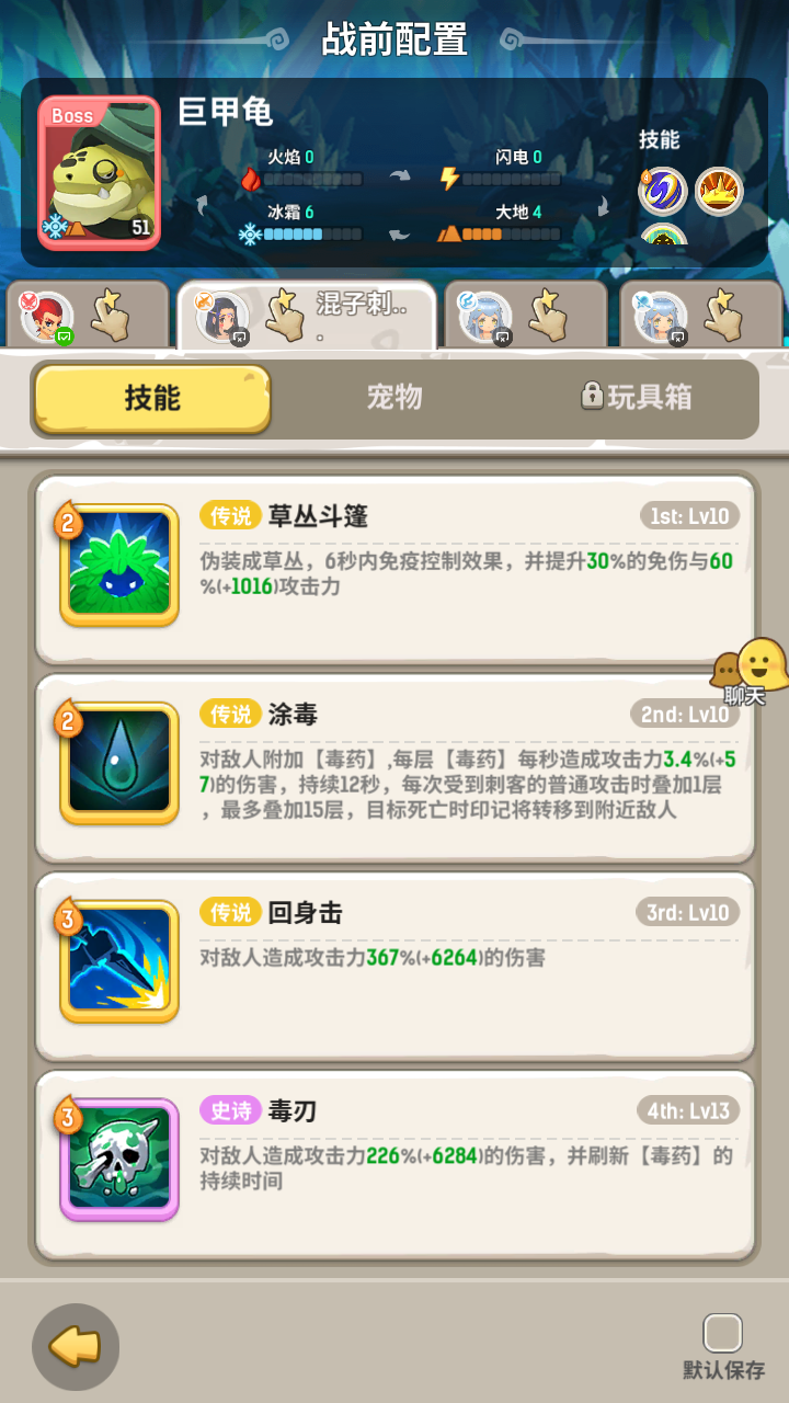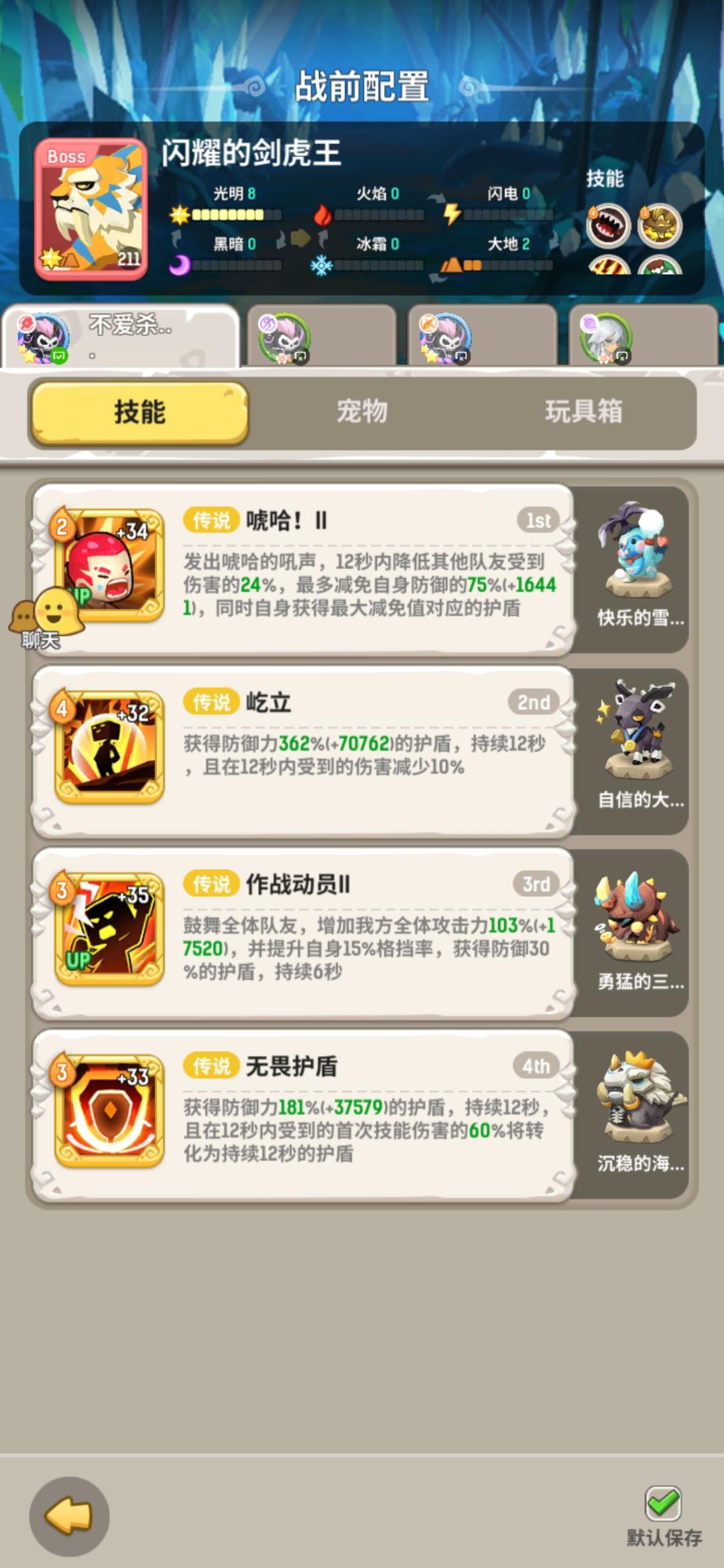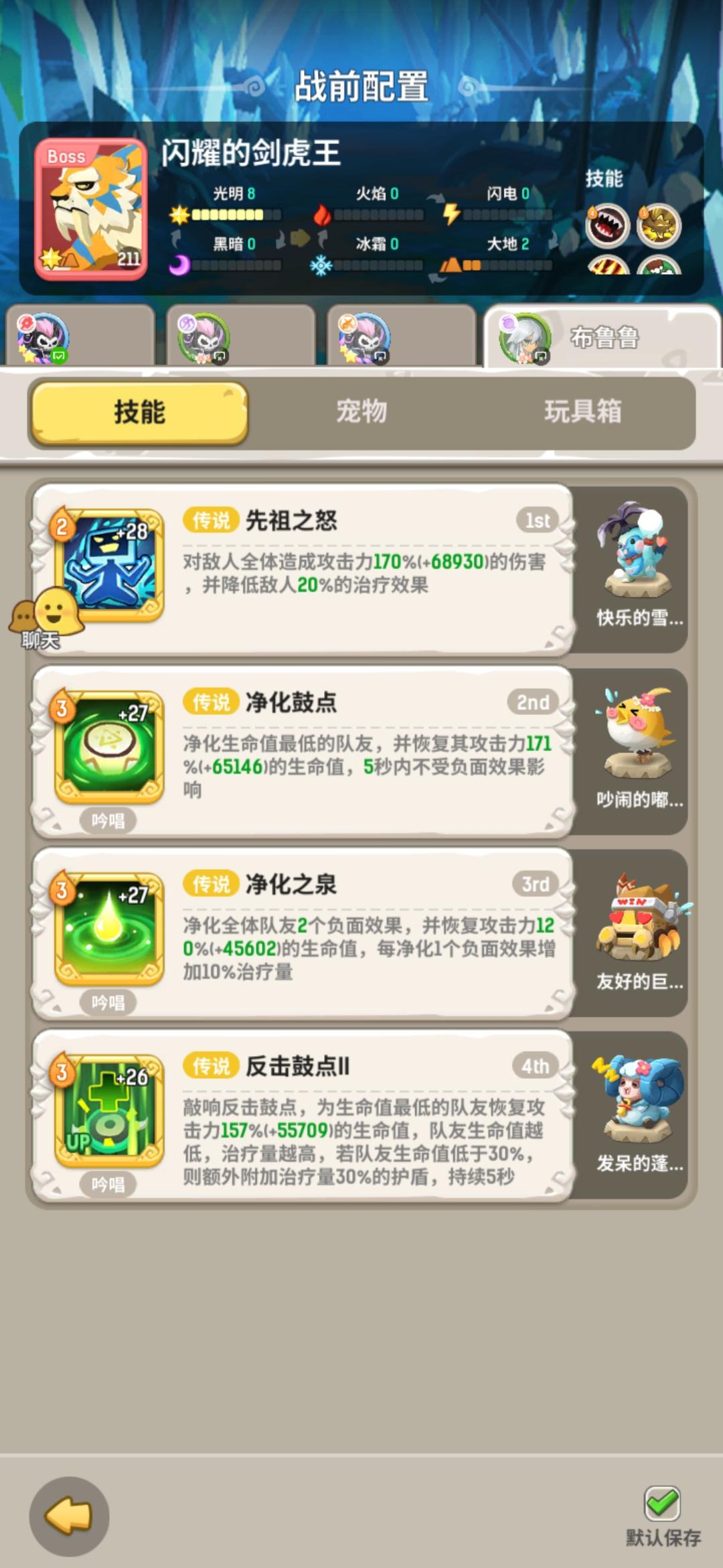 牦牛王斗:旋风斩 - 无畏之血 - 蛮荒血脉 - 血脉之力德:变身粒粒 - 树之结界 - 治愈 - 守护之歌刺:驱散之刃 - 涂毒 - 破甲突刺 - 毒刃猎:呼唤猎鹰.辛 - 呼唤猎鹰.伽 - 驱散之箭 - 贯通一箭白牦牛王斗:旋风斩 - 无畏之血 - 蛮荒血脉 - 上勾拳德:变身粒粒 - 生命种子 - 万物宁静 - 守护之歌刺:驱散之刃 - 涂毒 - 草丛斗篷 - 毒刃猎:驱散