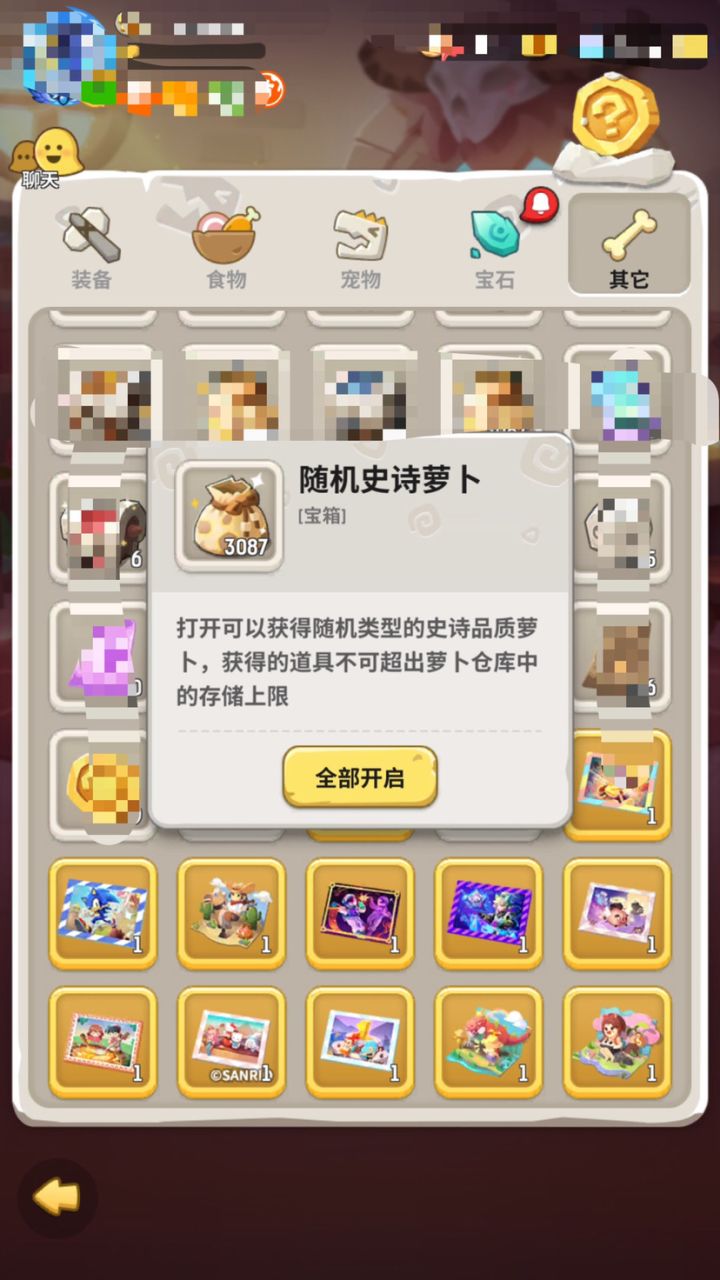 每种萝卜上限500,建议官方修改下设定,可以选择数量开启包裹