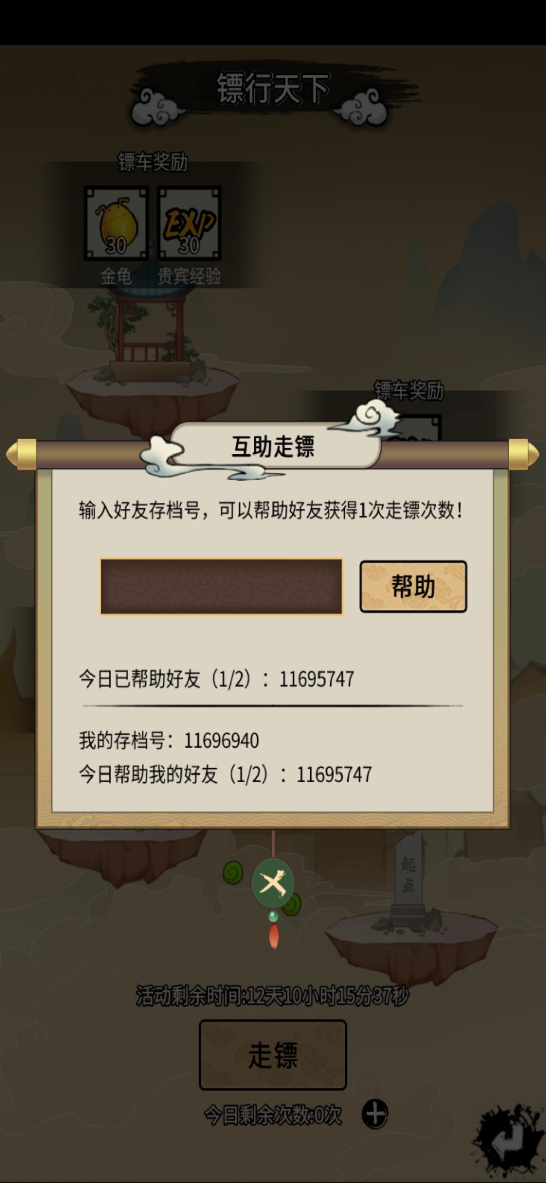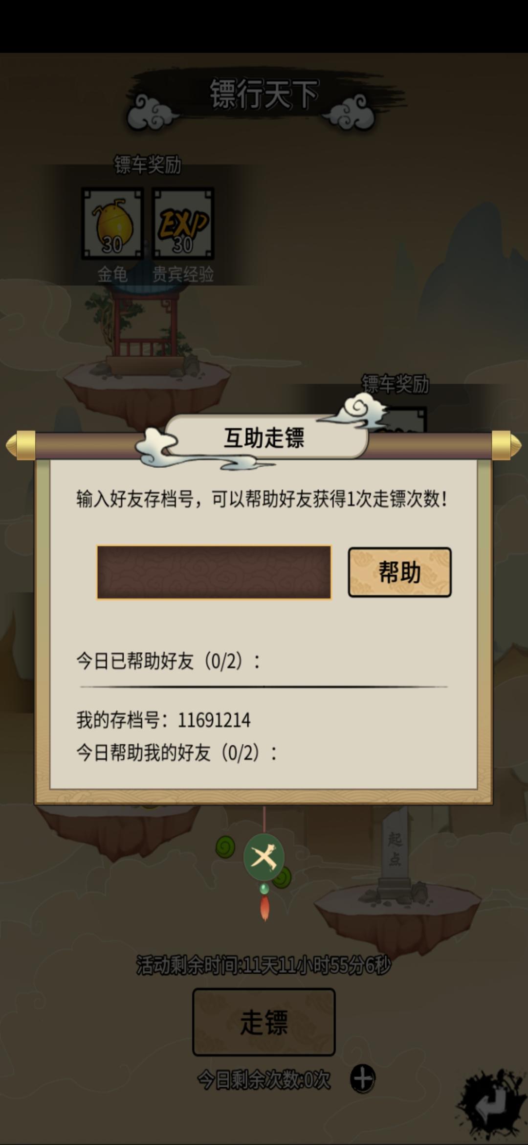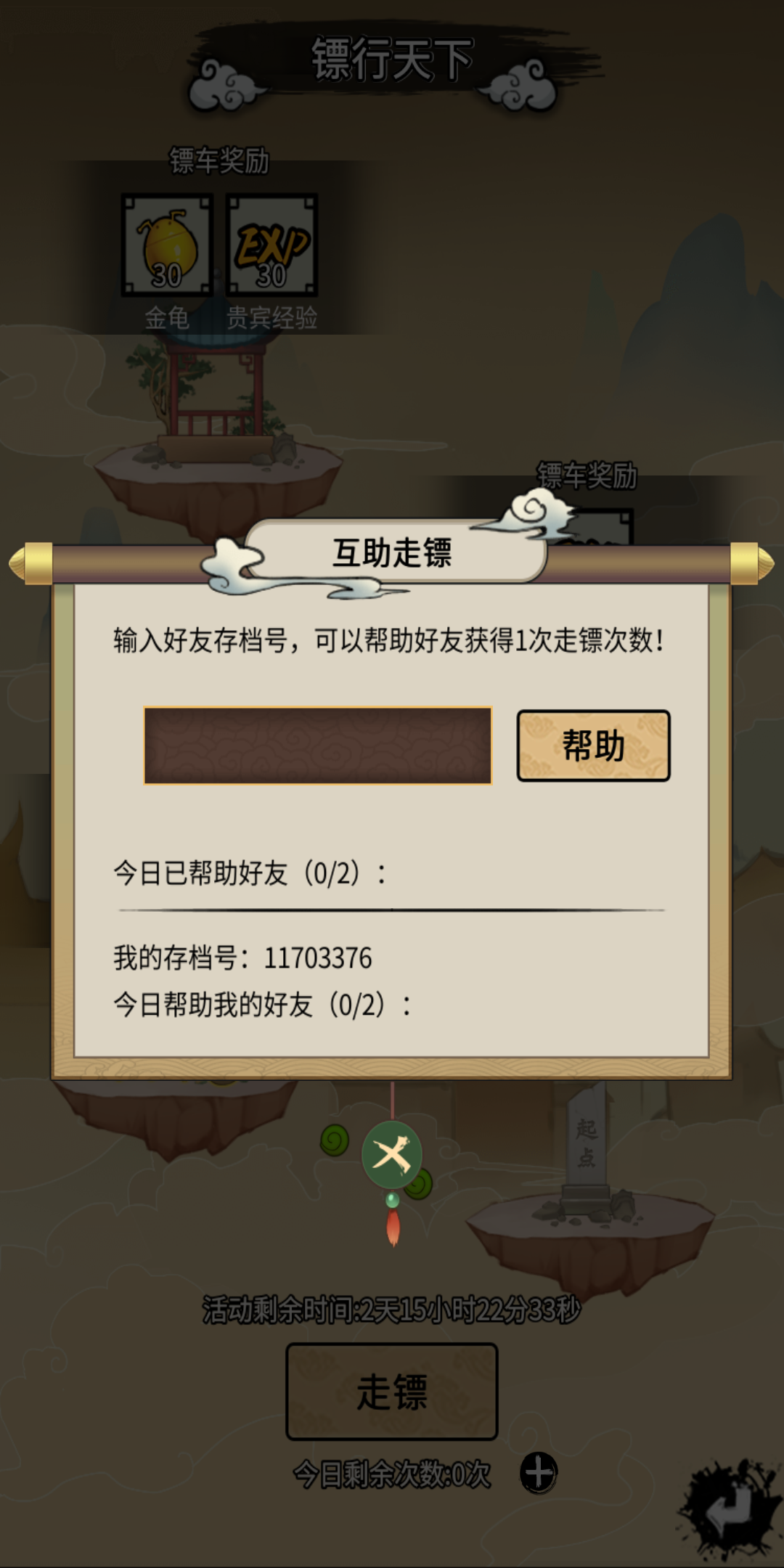 天子江湖,每日走镖缺一人,每天最晚中午左右会上线互助走镖。江湖历练184天,V15。存档编号:11571273。