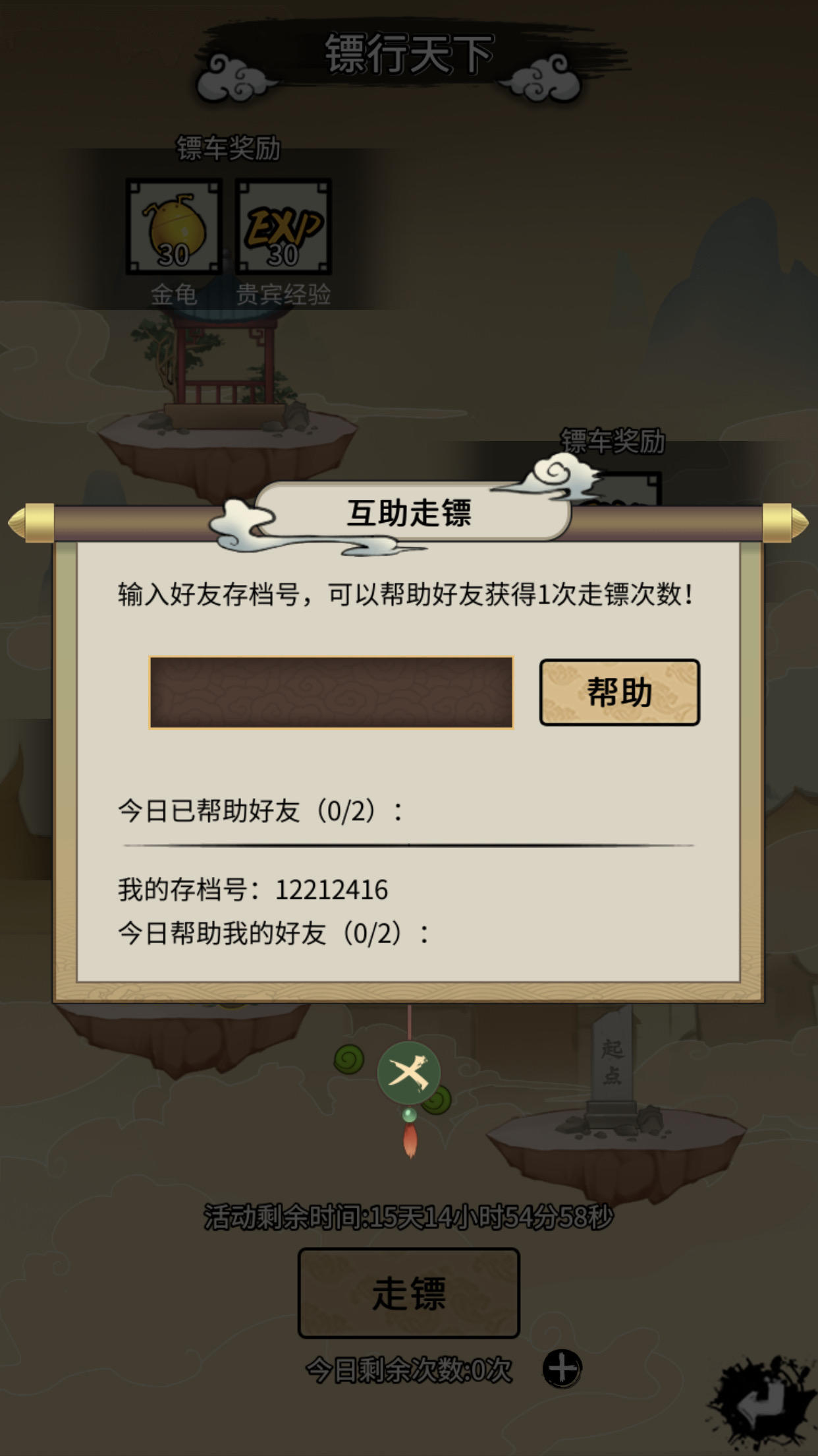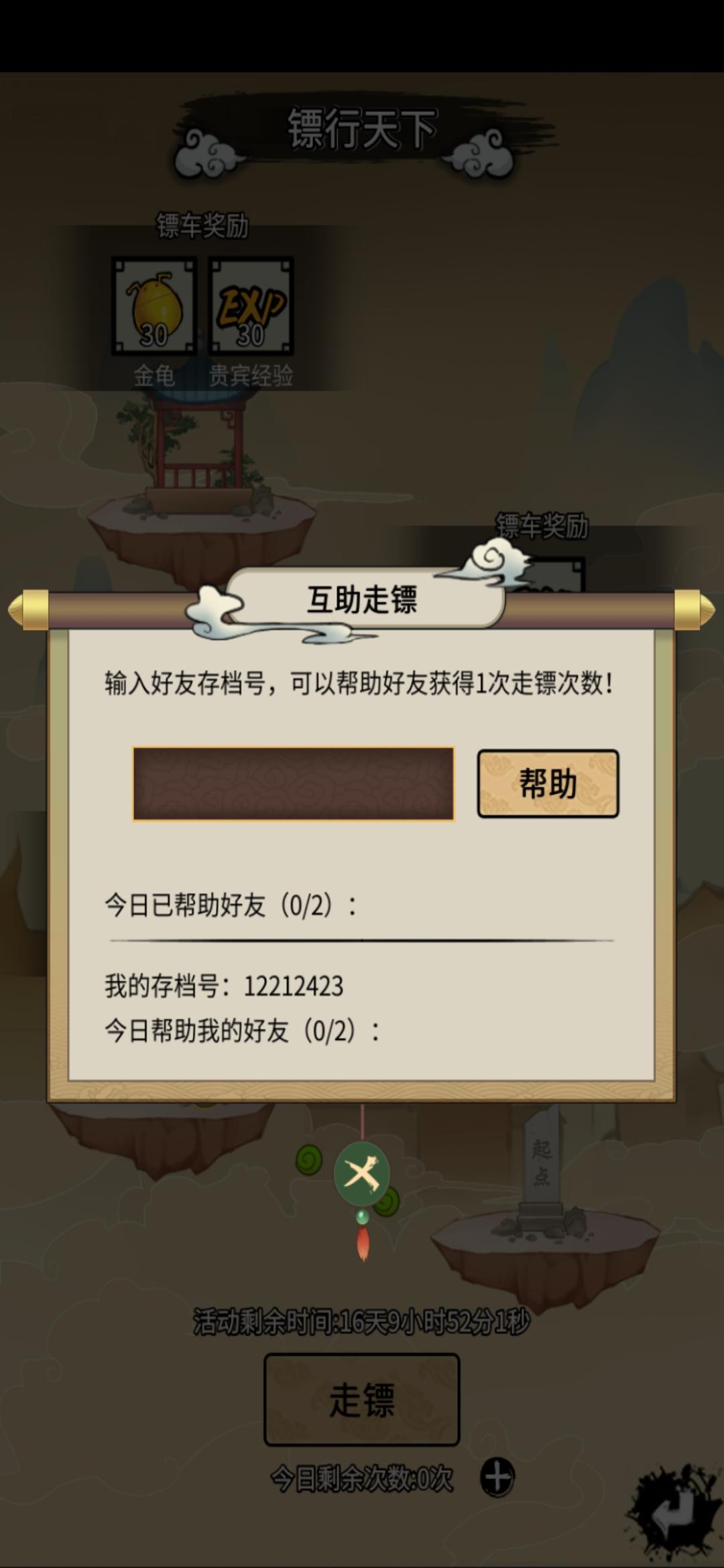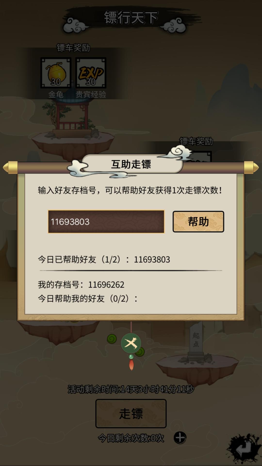 天字江湖镖行天下互助,帮我加了的下面留个言留存档号,可以每天固定互助到活动结束!