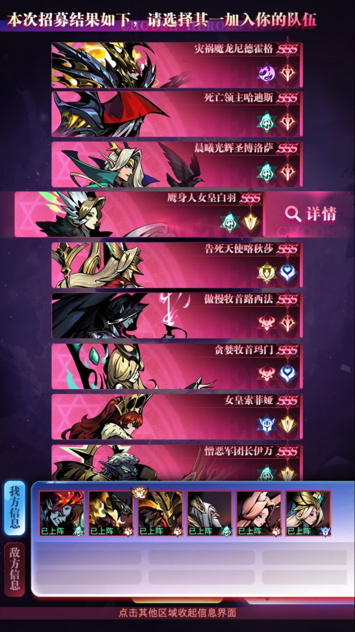 如题我从开局选了狼人开始就不对味了。。。后面一个比一个离谱,几乎看不到输出,全是肉和奶。果不其然,打不过,选了招募。。。挺绝望的。。。场上场下都没有输出怎么赢大头优化一下开始的挑选算法,或者增加一个倾向操作,让每轮挑选前可以选定一个挑选倾向,如输出,肉盾,增加该倾向英雄出现几率招募其实更需要这个功能,完全随机的招募并不适合,想像一下玩家什么情况会选招募,阵容已经不合理了,随机抽取完全是