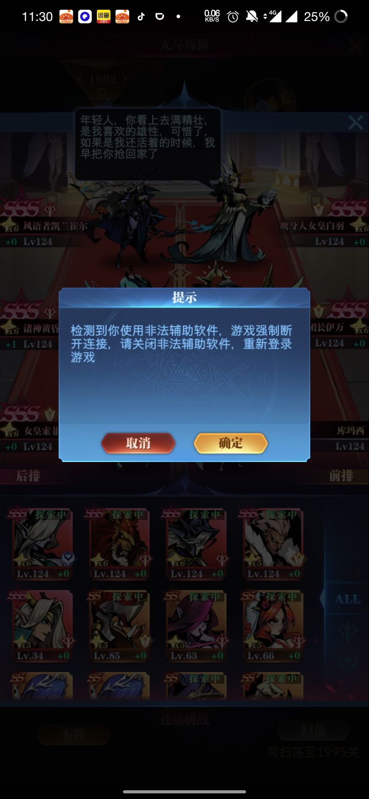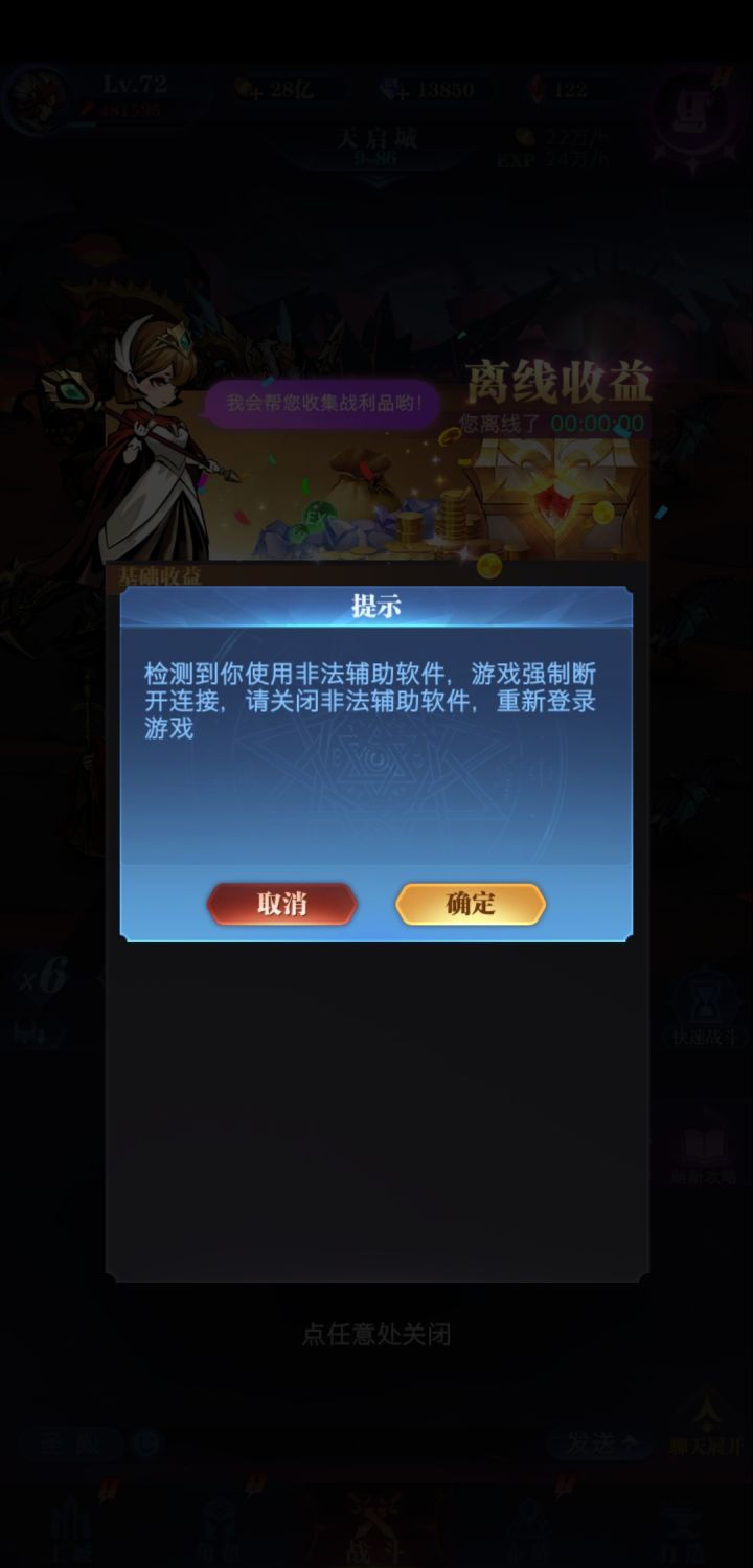 前几天还好好的,今天登录以后一直提示这个,我什么也没开。手机重启以后还是这样,会不会导致封号啊?求解决办法