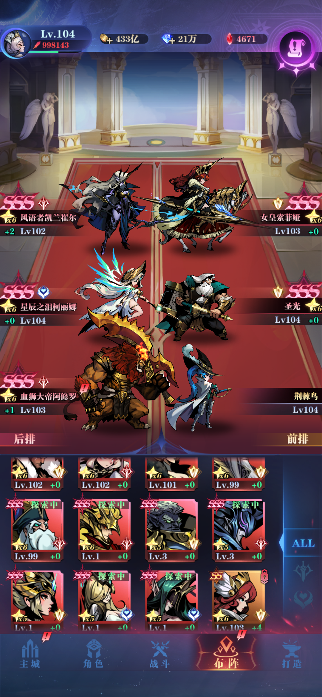 看了众多亡灵的攻略都需要风雨,但是刚入游戏的时候风雨没有返场,苦于解决不掉后排。只能自己想办法。站位如图这关需要觉醒白羽神器,提供吸血,然后调整白羽攻击力小于男主,第五攻击力,抗住罗杰第一回合。男主带天神,最后控制。过法:亚瑟控罗杰,第一回合亚瑟不死,带走猪二三回合控住魔导和星辰,带走两个圣光和魔导。
