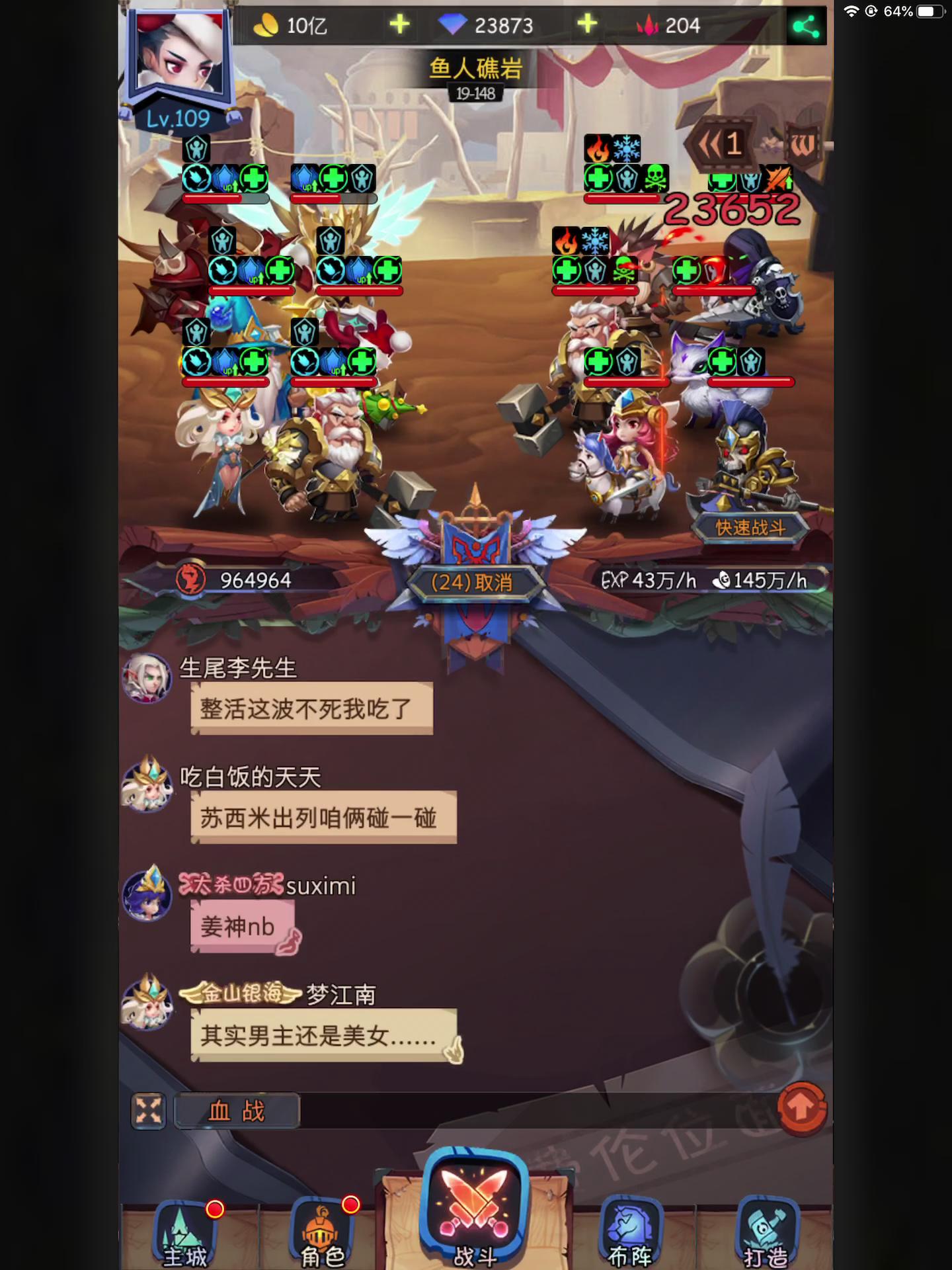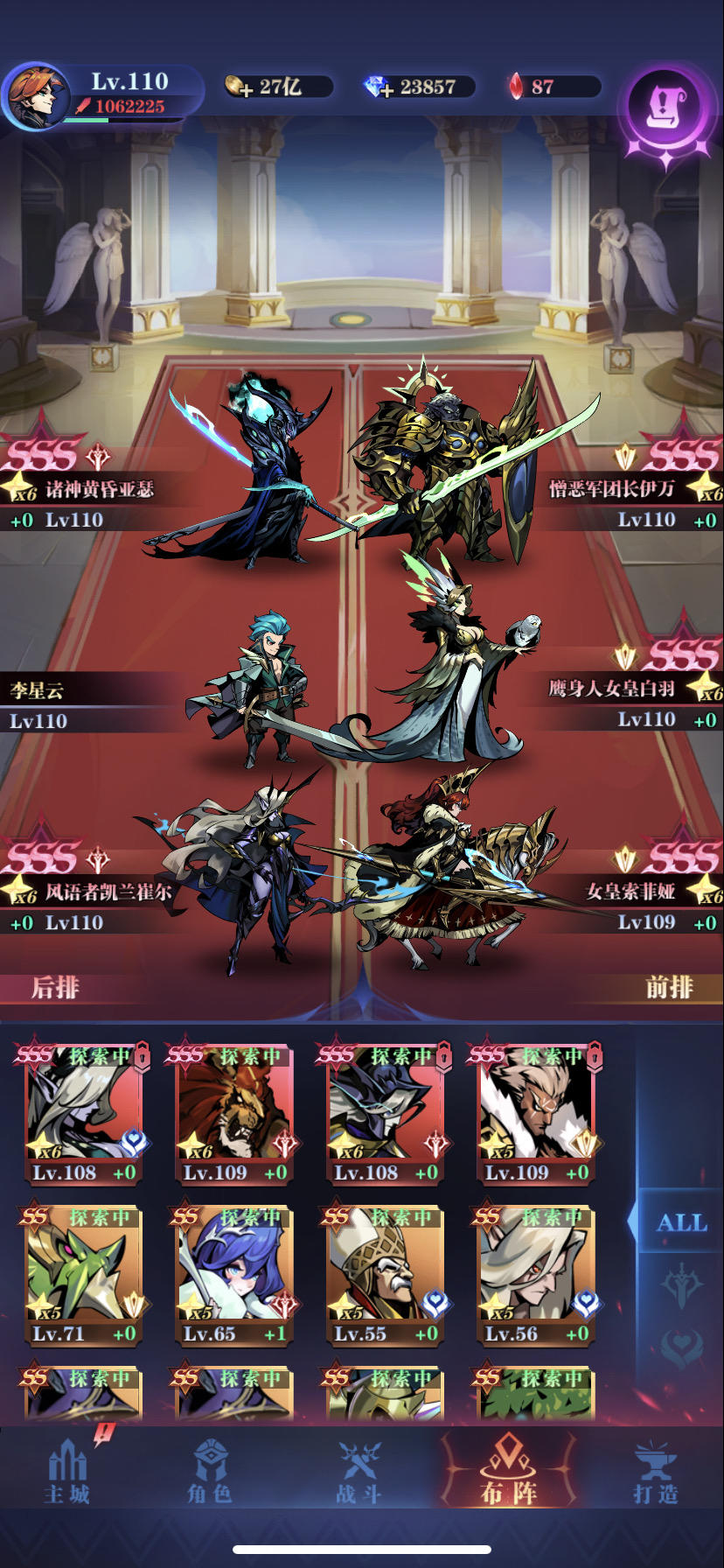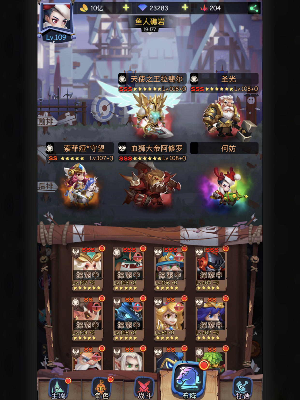三个圣光,后排奥托克,波波,阿呆可能是我亚瑟装备不好,10回合总是打不完,原本想睡觉。但看到仓库里还有一只狮子( •̀∀•́ )因为奥托克打后排,如果圣光再补一刀,风语和呢喃两个脆皮就死了,所以让他们站前排。速度:风语>呢喃≥伊万>亚瑟>狮子>男主(禁卫+黑暗牧师)思路亚瑟和风语先打减抗性,狮子补伤害。狮子只有50%暴击,有风语神器基本上每次都是暴击。
