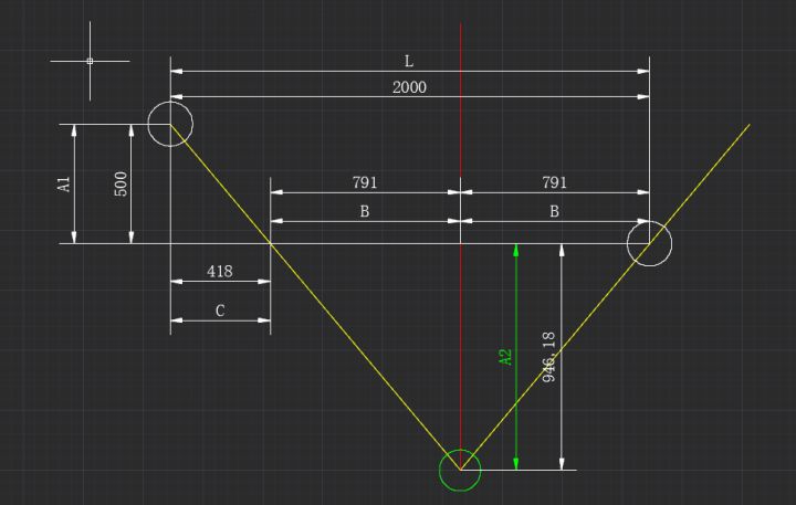 今天闲得蛋疼,突发奇想不如算一下玛格丽特大招如何同时炸到高度不一的两个怪(没啥卵用,纯粹闲得蛋疼,毕竟不如自己贴贴队友或者怪物把预瞄线拉到最短还能稳定炸出两段伤害,一段是大到自己伤害转移给敌人的)废话说完,上图,CAD画的图中,白圈是两个不在同一水平面的怪物,绿圈是玛格丽特,黄线是玛格丽特的大招线路。A1表示为两个怪物之间的垂直距离(图中例子是500)。A2表示为较低位置的怪物和玛格丽特之