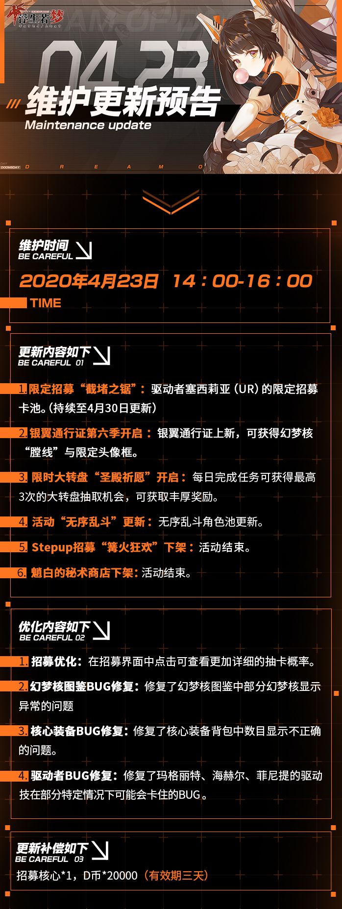 周三啦~ 五一小长假倒计时1天!节日当然要来点特别的更新咯~支线副本和全新驱动姬皮肤来啦~~ 你心动了吗!以上~感谢您的支持!祝大家假期愉快!!