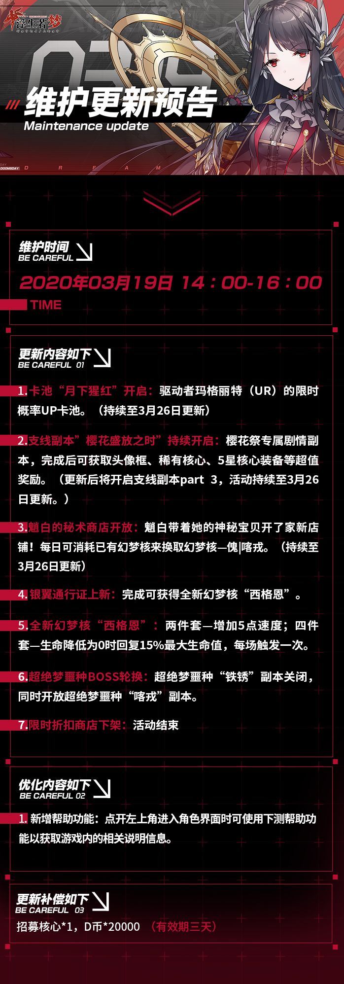 亲爱的教官大人:游戏已于4月5日0点重新开放登录,并通过邮件为各位教官发放一份小礼,感谢各位在停服期间的理解与配合。内含:招募核心*3、芯卡*500、D币*100000