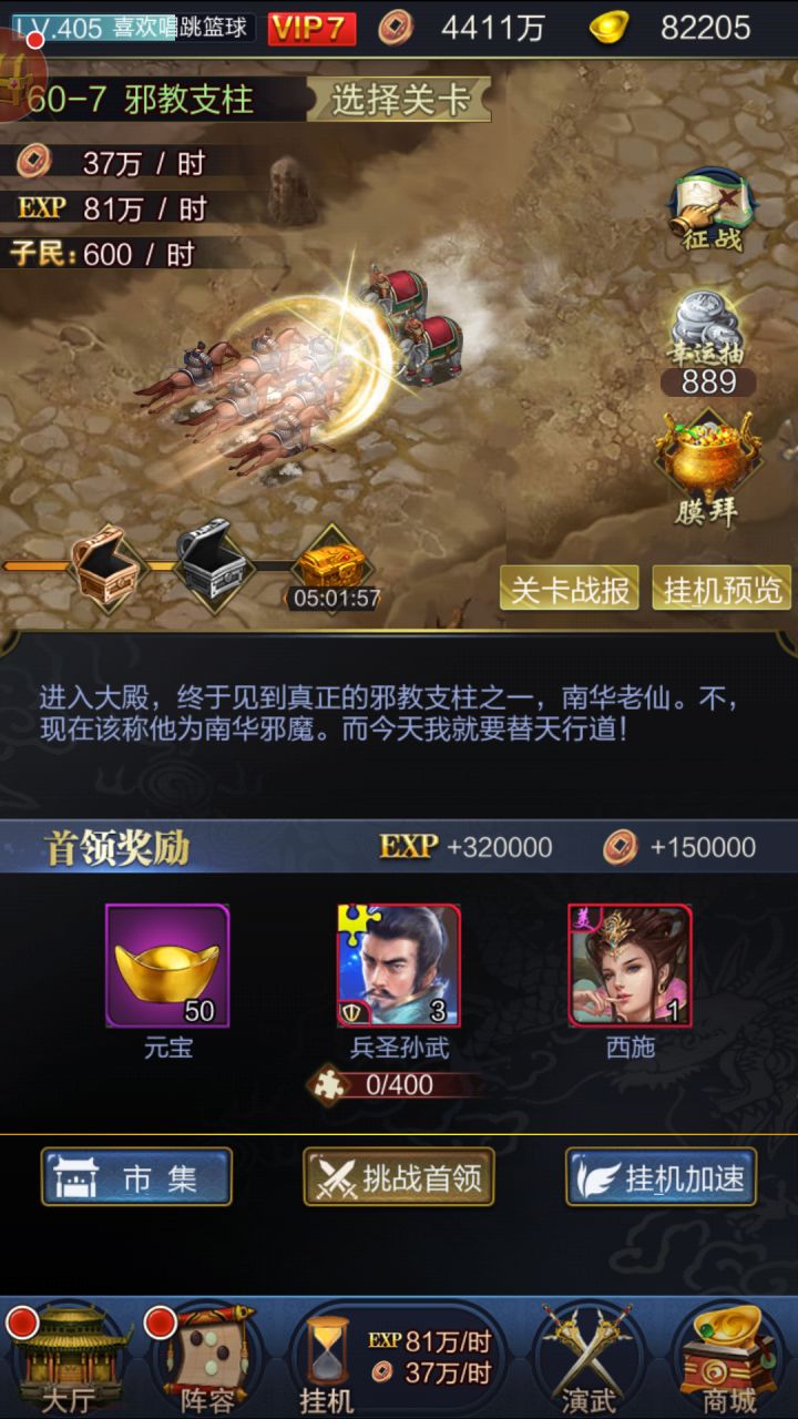 皇帝养成计划的玩家们,大家好,我是游戏时长87天,氪金278块钱的坤坤,喜欢唱,跳,rap,玩游戏。继白嫖诸葛亮,秦始皇之后,坤坤给大家带来白嫖孙武的攻略,废话不多说,上图。到达孙武405级, 阵容如下: 到了400级,传统武将的输出已经严重不足了。这里就需要新的输出型武将了。所谓神豪用薛仁贵,土豪用张春华,屌丝用关银屏(关银屏必须400级9阶才能使用,前期无用)。关银屏作为唯一的一个连击+