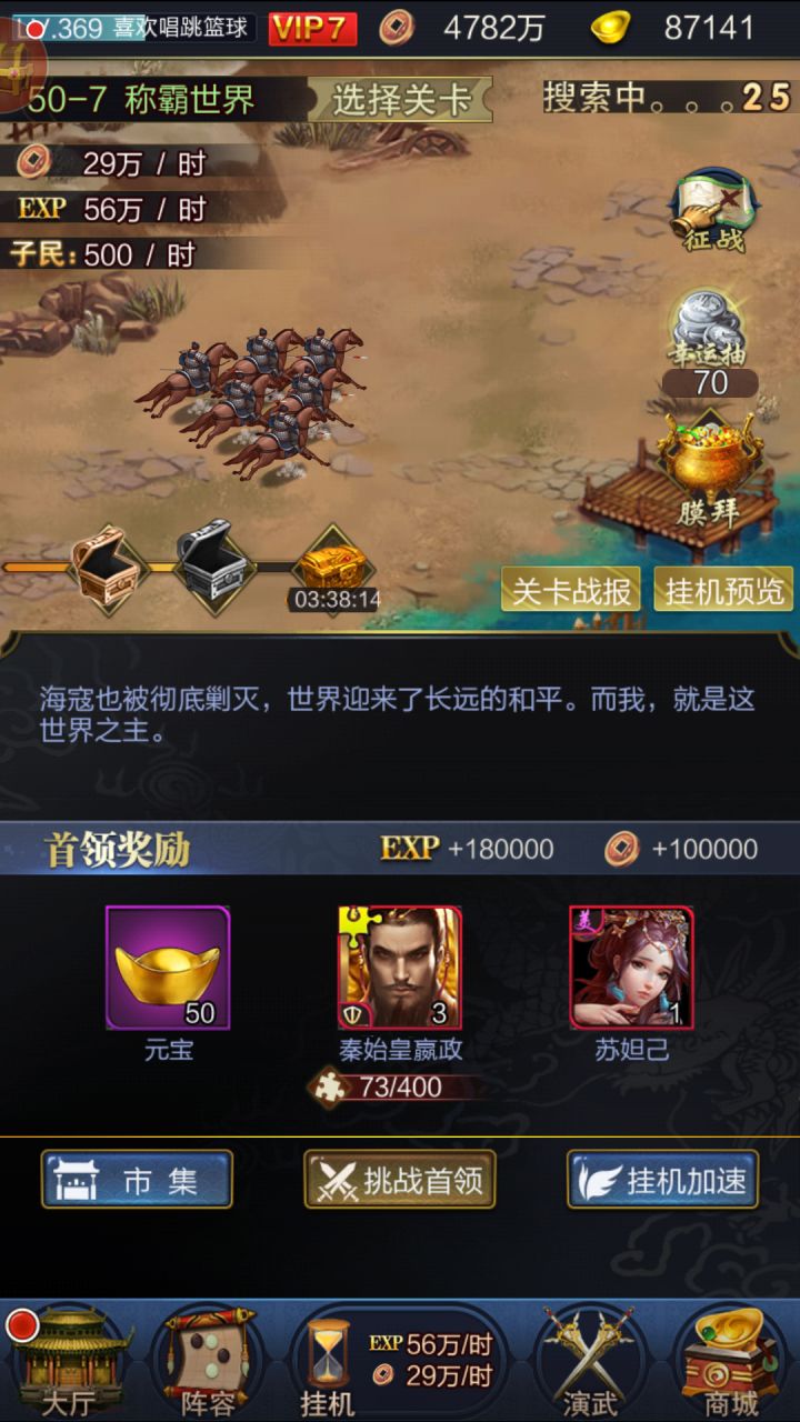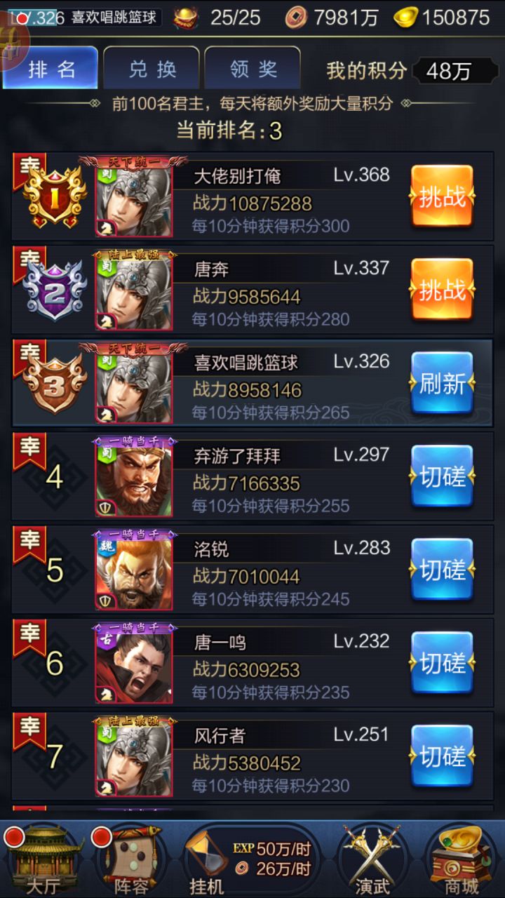 大厅里的政令和演武:两个都是每天25次,次日刷新。政令是每天给元宝(平均每次50元宝),声望和子民;演武是给经验和积分,积分用于兑换元宝和资源,挂机时也会根据排名获得积分。活动介绍青梅煮酒:每天两次(中午10点-14点,下午18点-22点),每次可以获得2枚幸运币(下面有详细介绍幸运币作用)五岳祭拜:每日一次,获得大量经验且必升一级,每两天祭拜还可以获得甲级宝物。(前期所有活动做完的时候