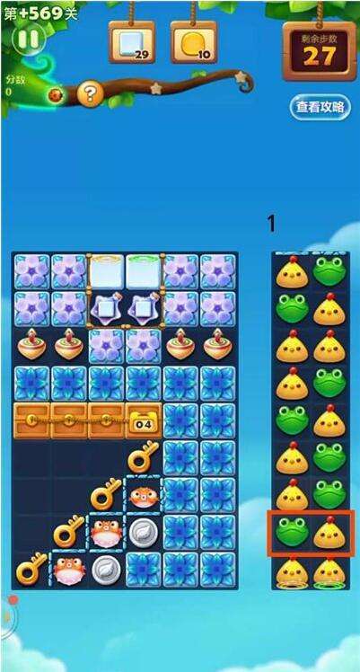 开心消消乐隐藏关卡+569怎么快速消除蜂蜜罐开心消消乐隐藏569关攻略,还不知道怎么过关的小伙伴们快来看看吧。隐藏569关怎么过:1. 首先在第二行,交换黄鸟和绿蛙,2.接着在倒数二行,继续交换黄鸟绿蛙;3.然后是第七行,交换 特效黄鸟绿蛙;4.再就是底部,交换特效黄鸟;5.后面消除冰块,激活星星瓶6.交换星星瓶,打破左侧顶部挡板,让掉落蜂蜜罐下来;7.最后打破蜂蜜罐,在中间或者