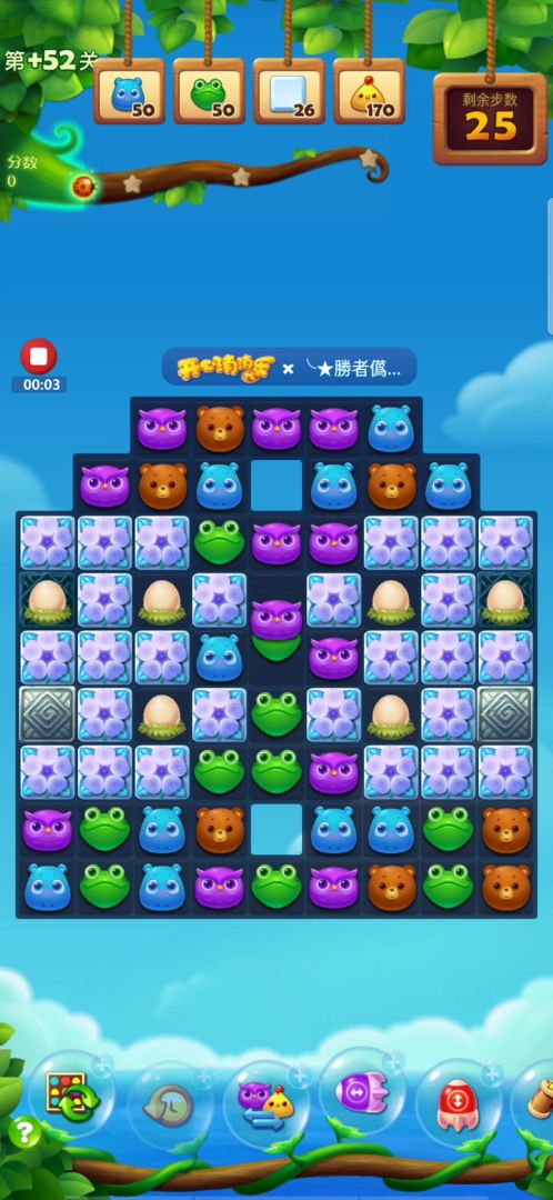 开局魔力鸟吸小黄鸡 不要走鸟➕爆炸(河马) 不然局面半天打不开后面很难过关 这关不难 局面打开了主打左边 可组爆炸加直线特效组合打 右边只有两种动物 运气好随便走一步自己能爆完基本不用管