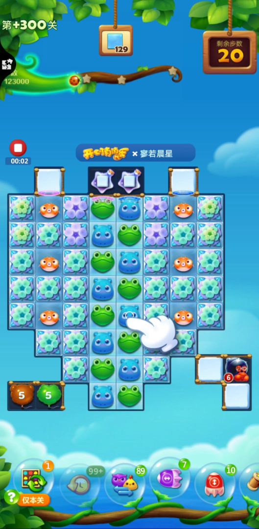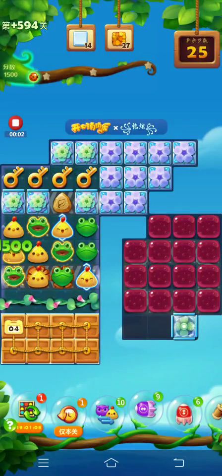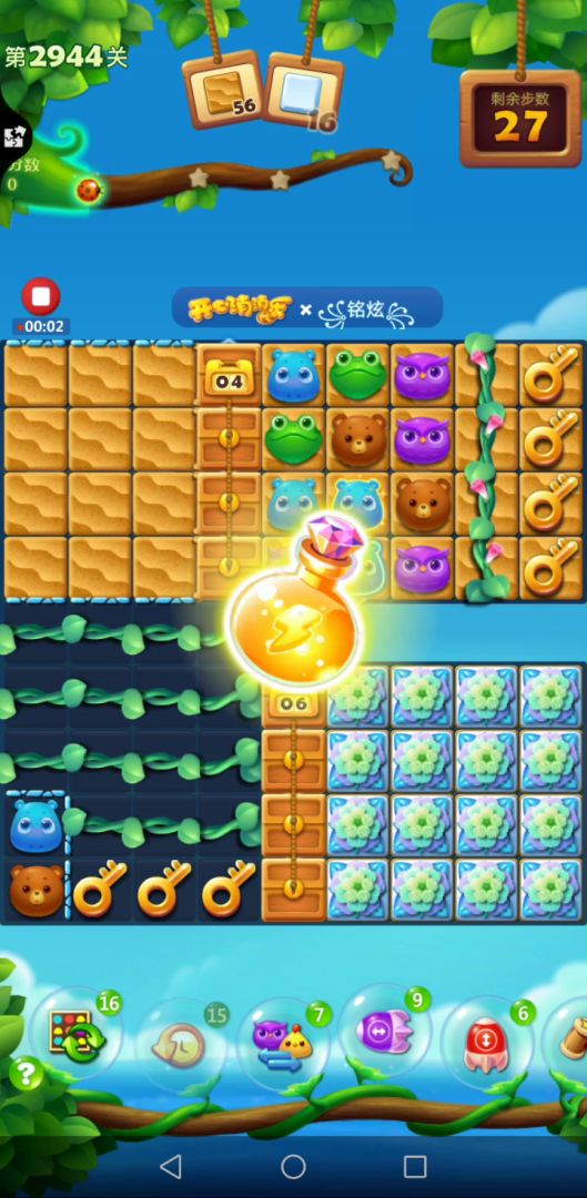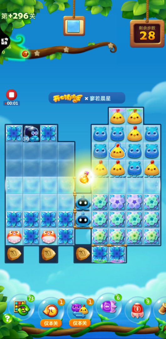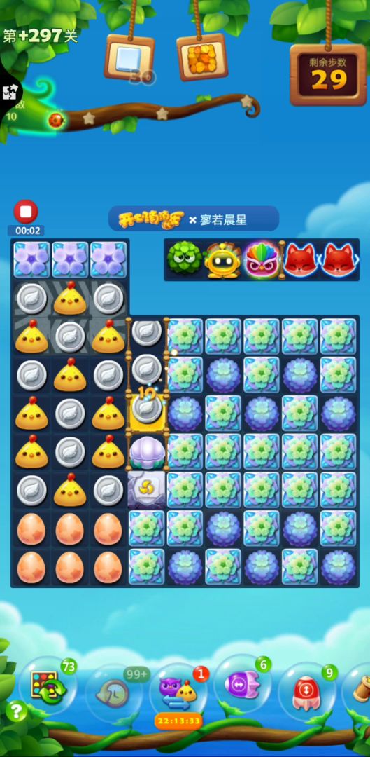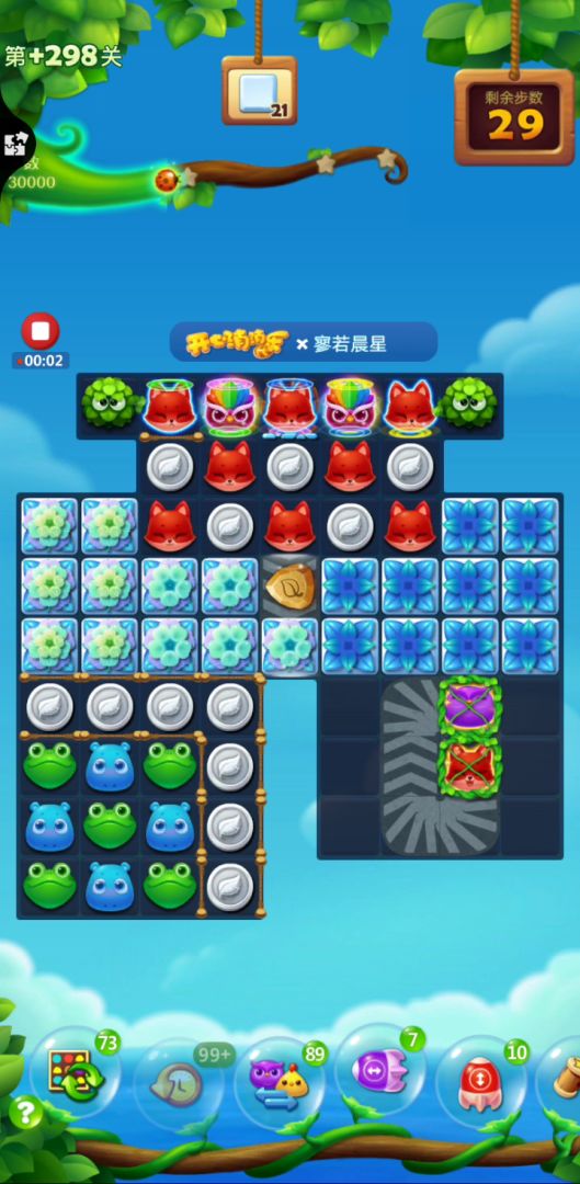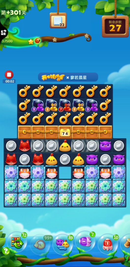 这关真是运气了,二星双前置直接上彩了,首先右上角开局,打花藤,左下角双鸟清屏,打掉几层树藤,再次双鸟清屏,运气好最后三四步,连续出了两个鸟加特效,分数直升彩(在左侧打树藤时右侧有几率出4T的话,可以提前打右下角的)