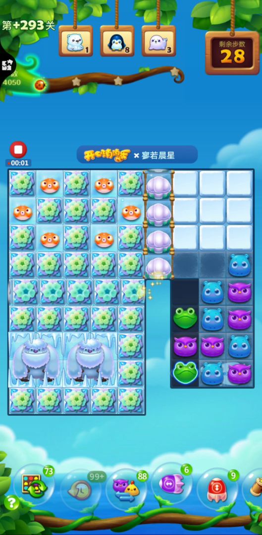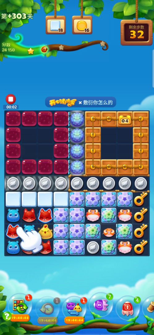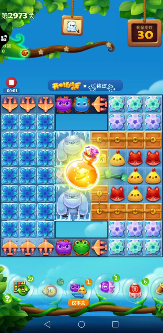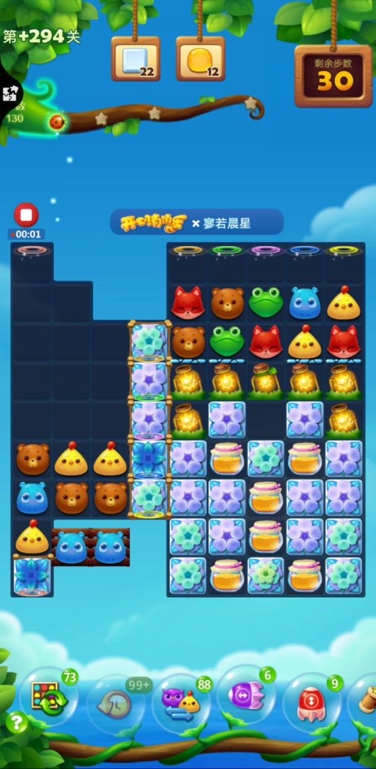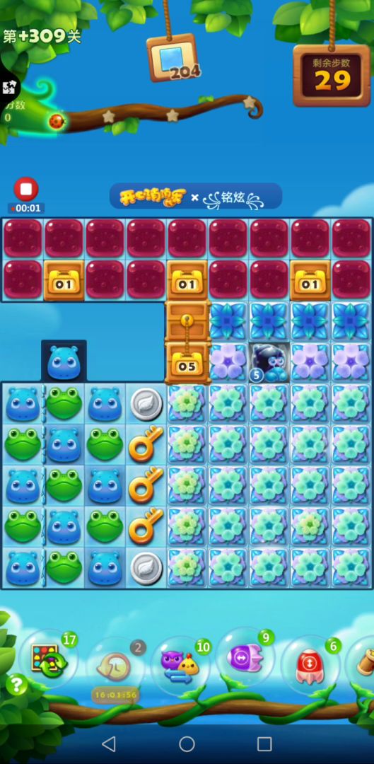 昨天打不动,今天一把过,当然用了两个快过期的限时道具,刷新很给力先消除蓝色,打击左下角放下来钥匙,收钥匙开局,重点关注右下角就可以了