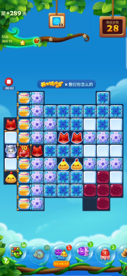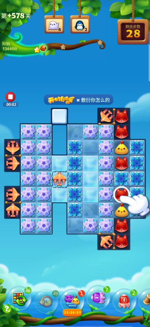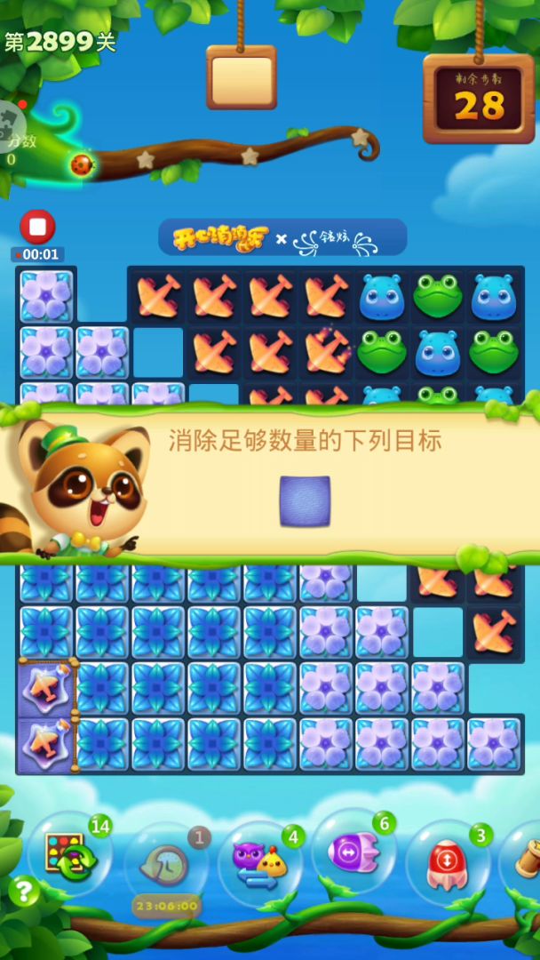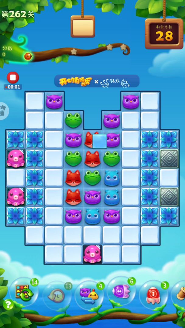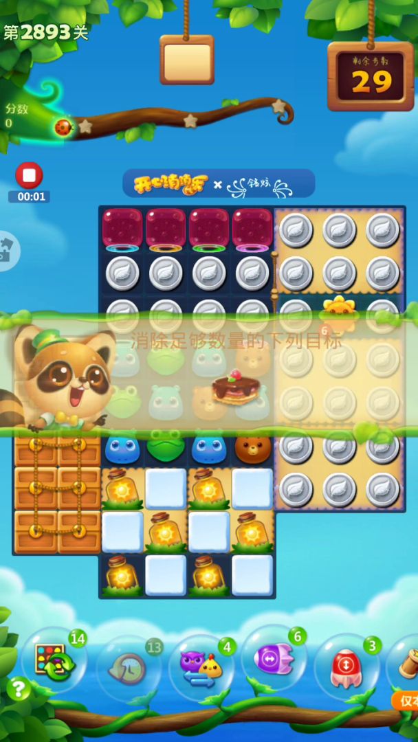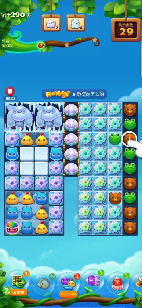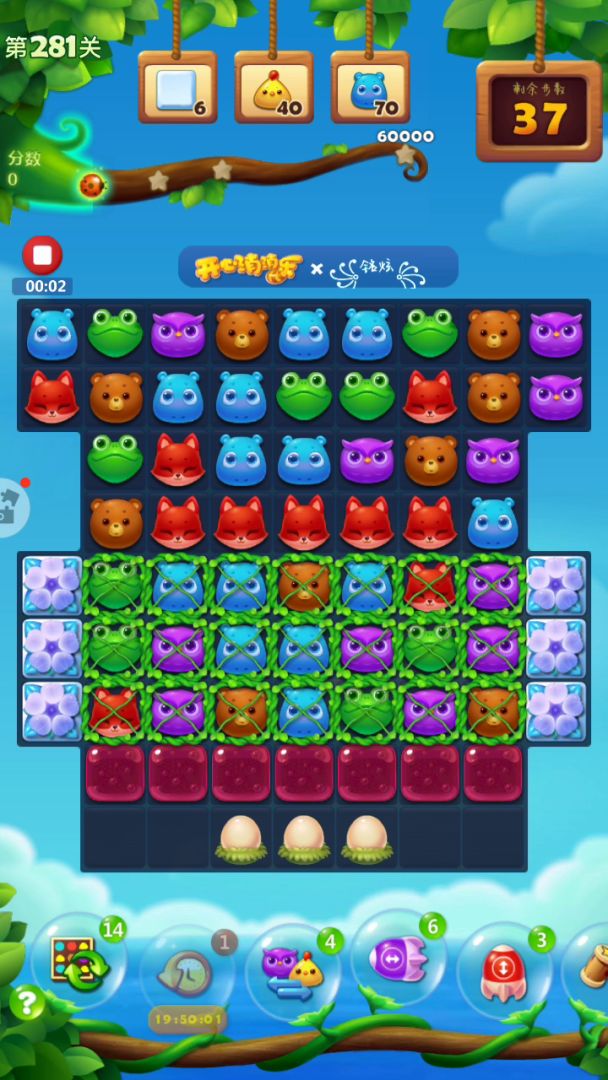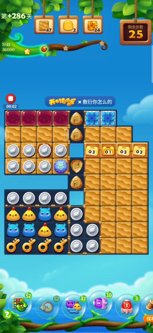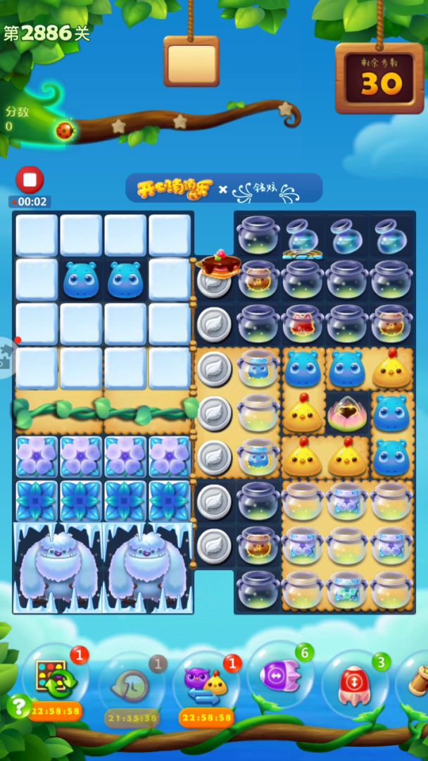 蛋糕关很是难打呀,这关右侧开局激活特效,左上角释放,右边会填满树叶,不需要管他,重点从左往右把右下角9X9的冰块打开,右上角有特效掉落,充分利用,三星7万多,彩星八万多