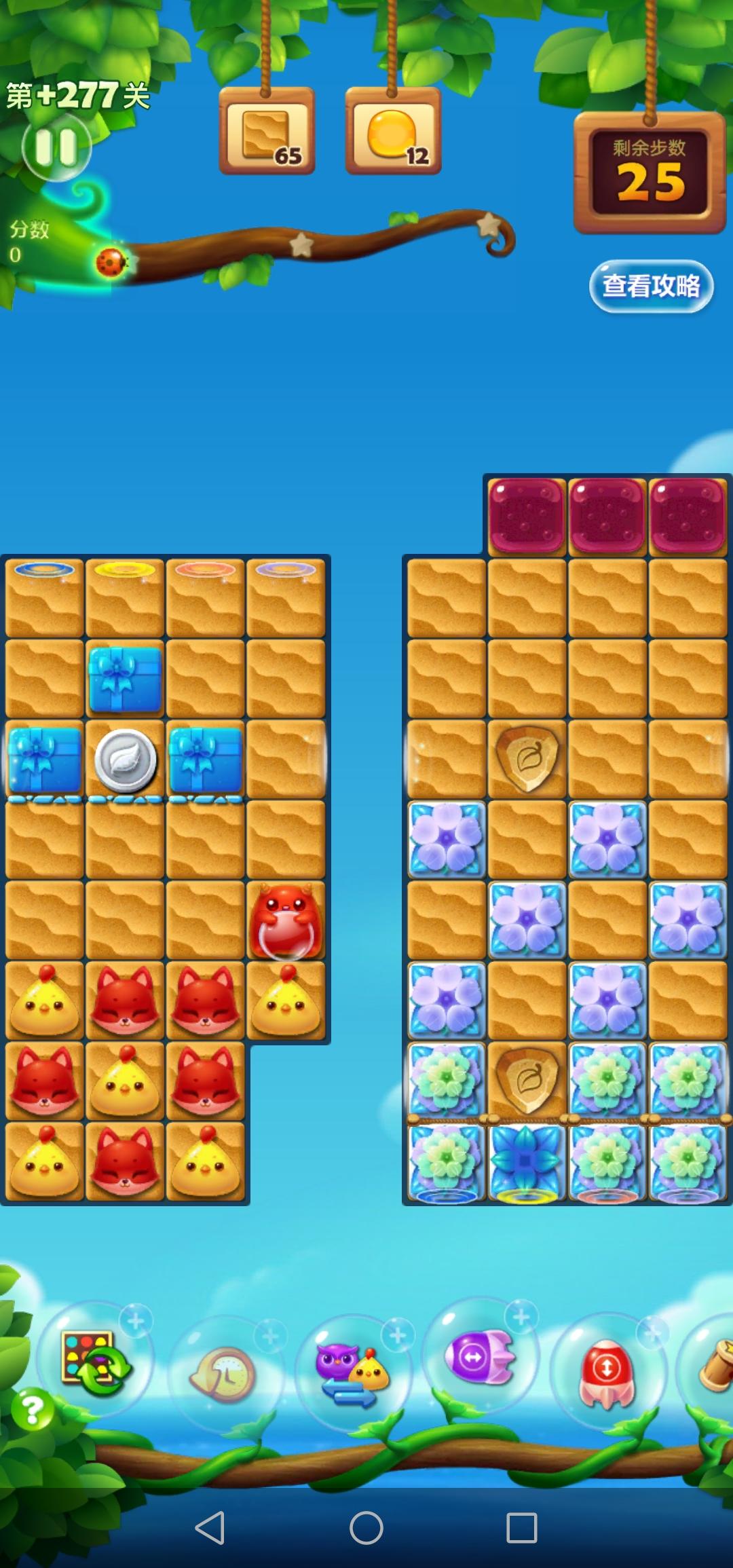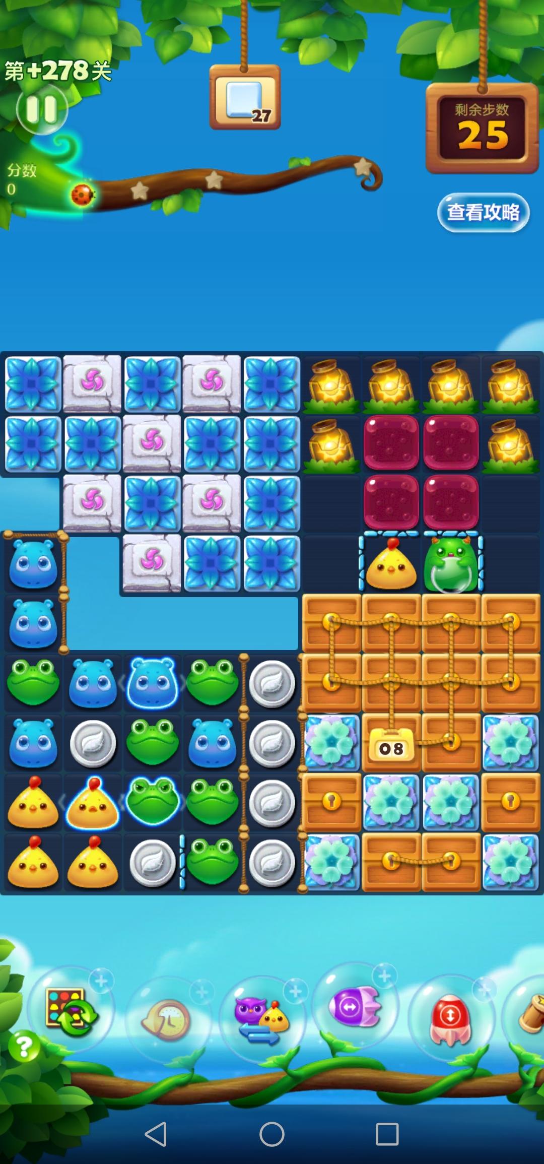 玩到这局时,正好得了一个限时强制交换,就换了个方式过关,感觉还不错,有限时强制交换道具的可以试一下开局打花藤,收钥匙,解锁大眼仔和寄居蟹最好能组个横直特效落底,激发后收走所有钥匙,省步数重点消除两个寄居蟹颜色的小动物,爆炸启动大眼仔的同时,击碎雪块 当翻板翻起,大眼仔边上是小动物时,强制交换出大眼仔这样就能更充分地利用大眼仔,有利消除
