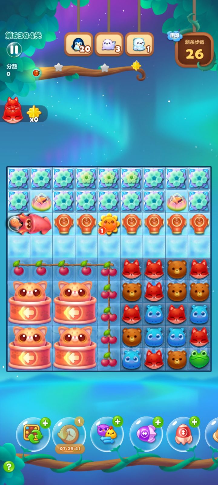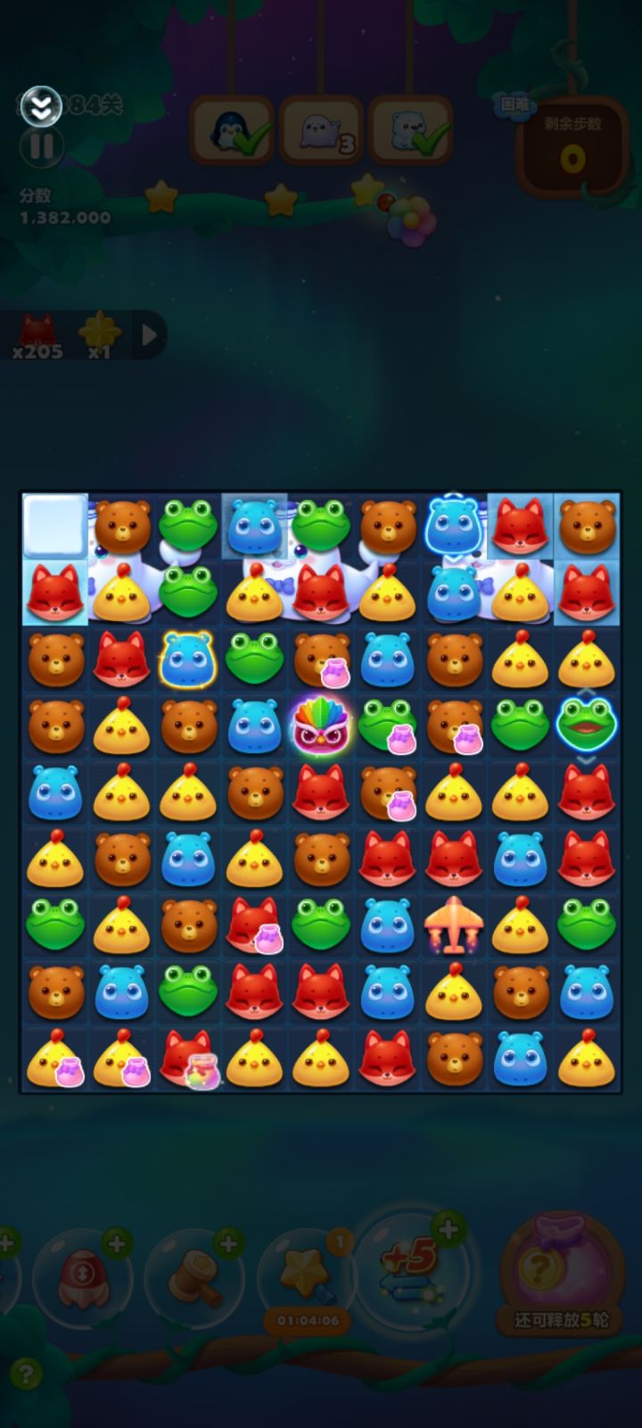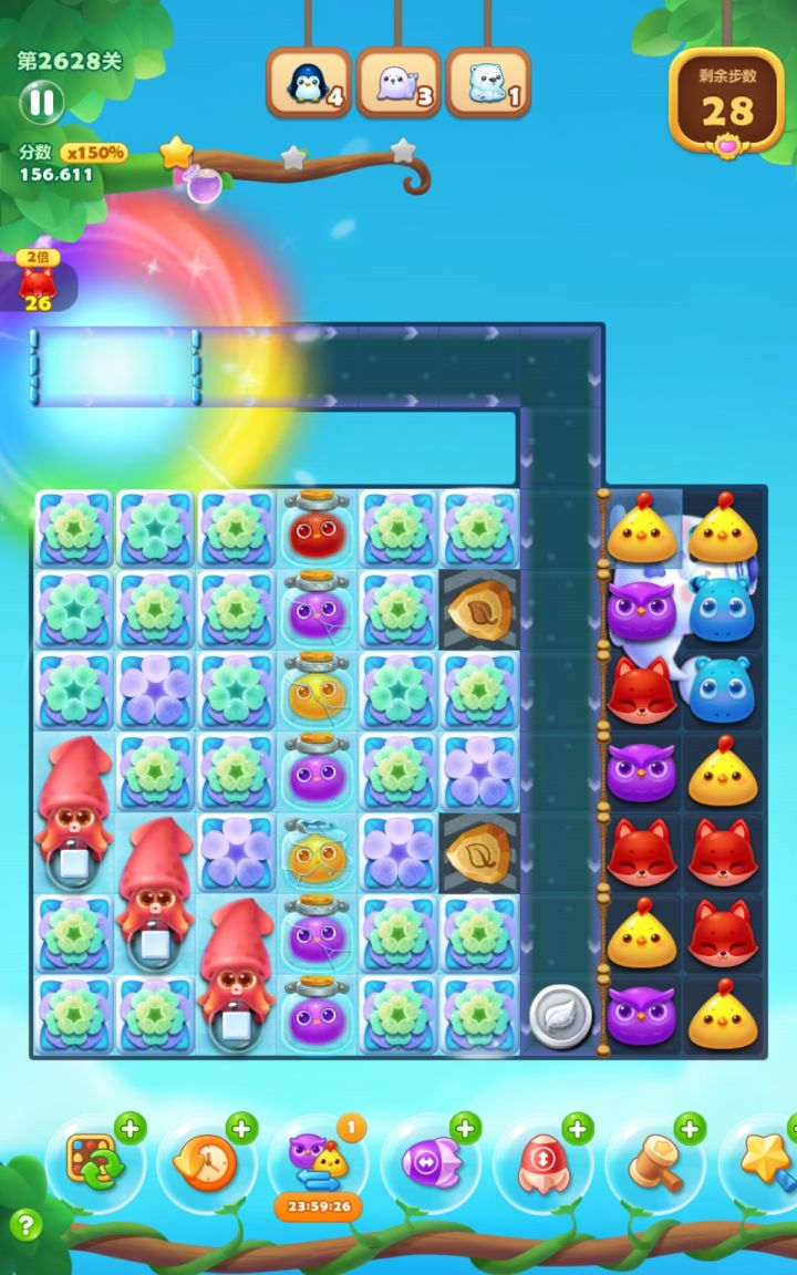开心消消乐的两个紫色的猫子一起合并简直不要太舒服,还不是轻松拿捏每一局恨不得把把都是特效