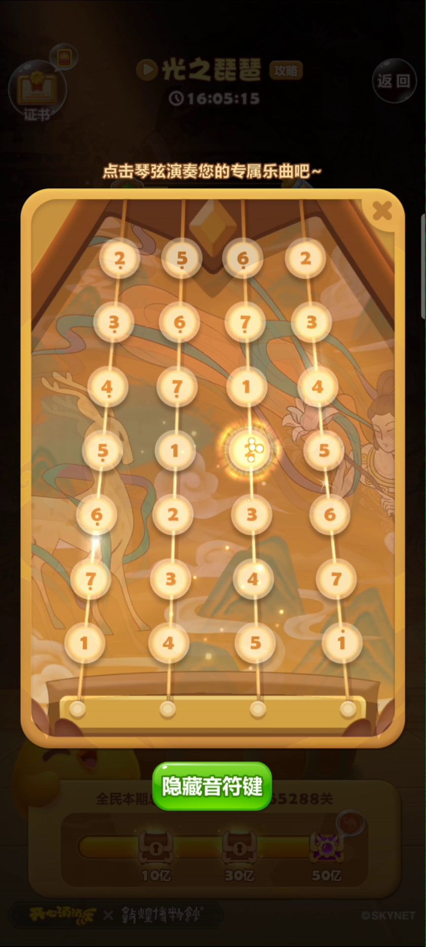 718遇见敦煌 相约消除节 主题一:【灵鹿复苏】 积攒绘艺之光,修复壁画守护瑞兽(经久吹黄沙,难回昔日彩) 主题二:【舞乐飞天】 积攒飞天之光,重现舞姿飞天前行(霓裳失五色,再难飞天舞) 主题三:【天音绕梁】 积攒伎乐之光,唤醒伎乐与之共舞(器乐遗古迹,难奏千年乐) 主题四:【丝绸之路】 积攒丝路之光,结伴同行重走丝路(商队无货物,止步丝绸路) 这一次消除节我们一起相聚敦煌,以「光之琵琶」为引,集齐敦煌之光使神物「光之琵琶」重新焕发光芒,共谱传承乐章 让开心回响千年~ 我的消消乐号:7797306357