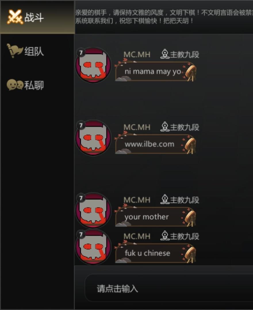 他先英文fuk u chinese 我回了他几句!然后他第二遍fuk u chinese! 我忘记在对局里举报了!怎么举报他?