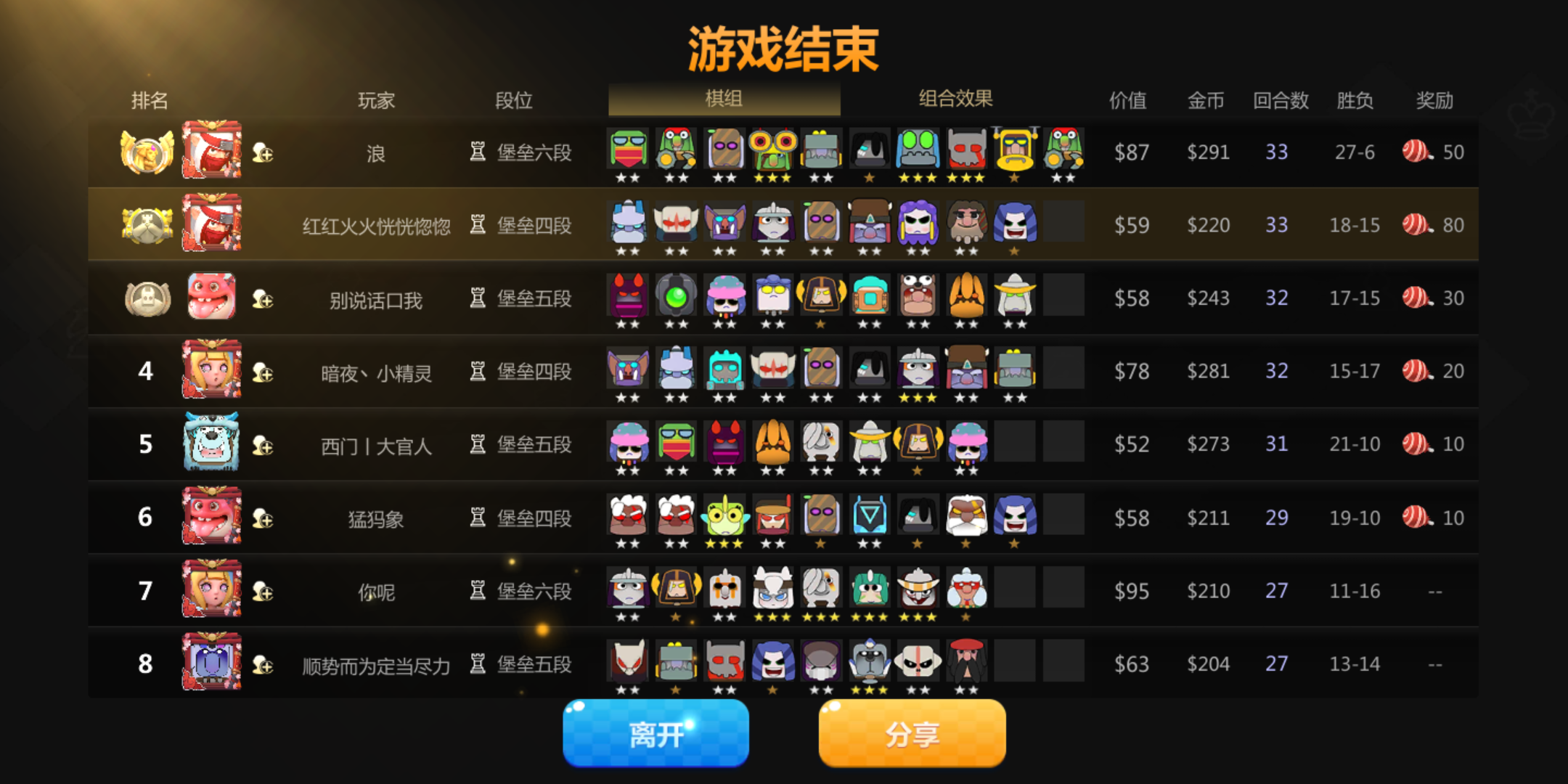 熬到最后决战,没一个3星,各种卡手牌,极度不爽!想要的不出,接着刷两下反而连出够另一可升星全是6战流导致战法没成型也就随便玩了,熬着合成出个刷新球想给雷神也许有机会翻身可就是不出雷神。我是真心讨厌打到后期,前中期玩起来很顺畅,到了后期各种不顺心,只要来两张给我升星还有机会翻牌。玩了几天的体验就是弱势的越到后头越难熬,一个棋子升3星前卡着3个手牌位置,两个准备升3星就是6个手牌位置。最恶心的一