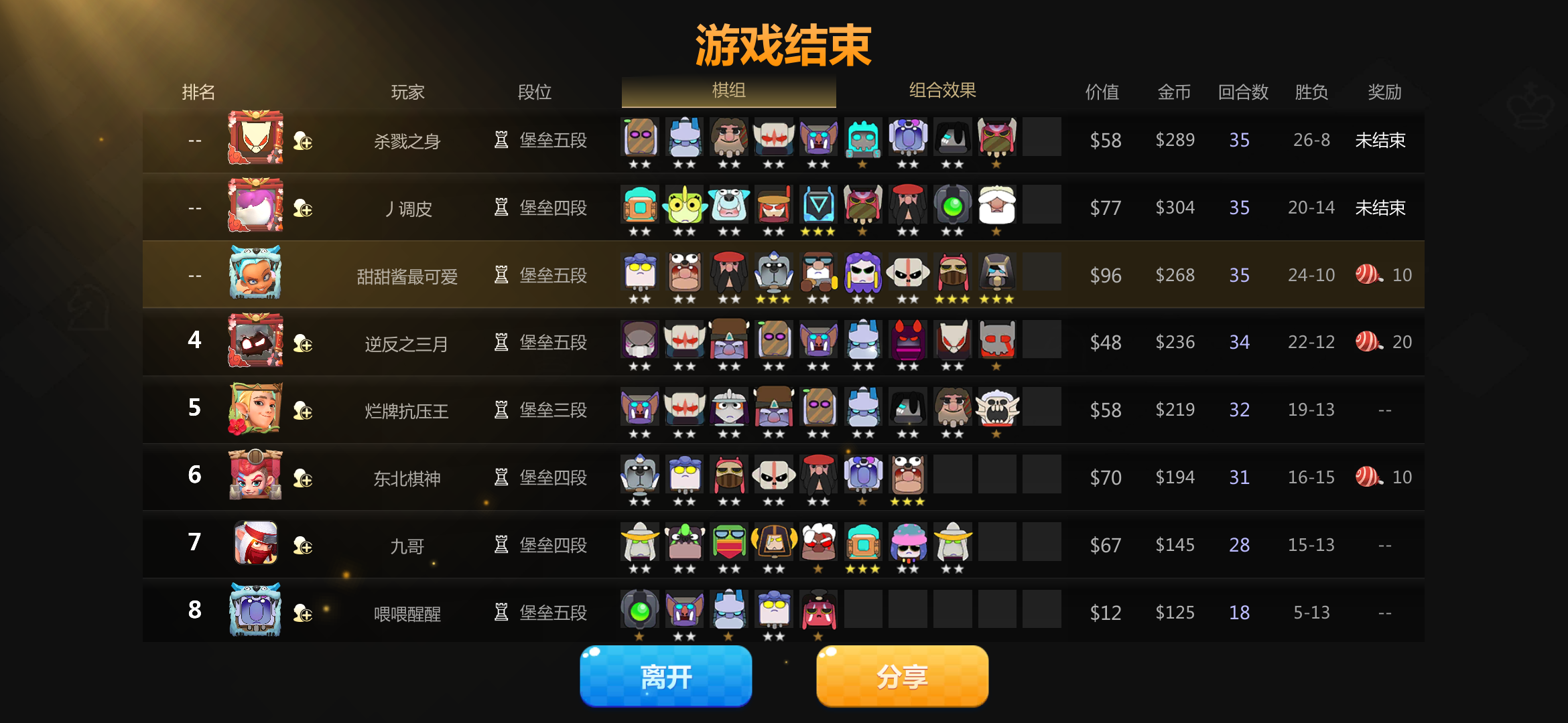 我特么玩得和别人不是一个游戏????天胡地精的局,我把别人都捶死了,最后吃鸡了显示我没结算??。本来准备开开心心六地精,我人口都加到9了故意少放棋想试下6地精,结果游戏突然结束了,你说网络断,那我故意少放棋的操作怎么又体现出来了,谁能解释下