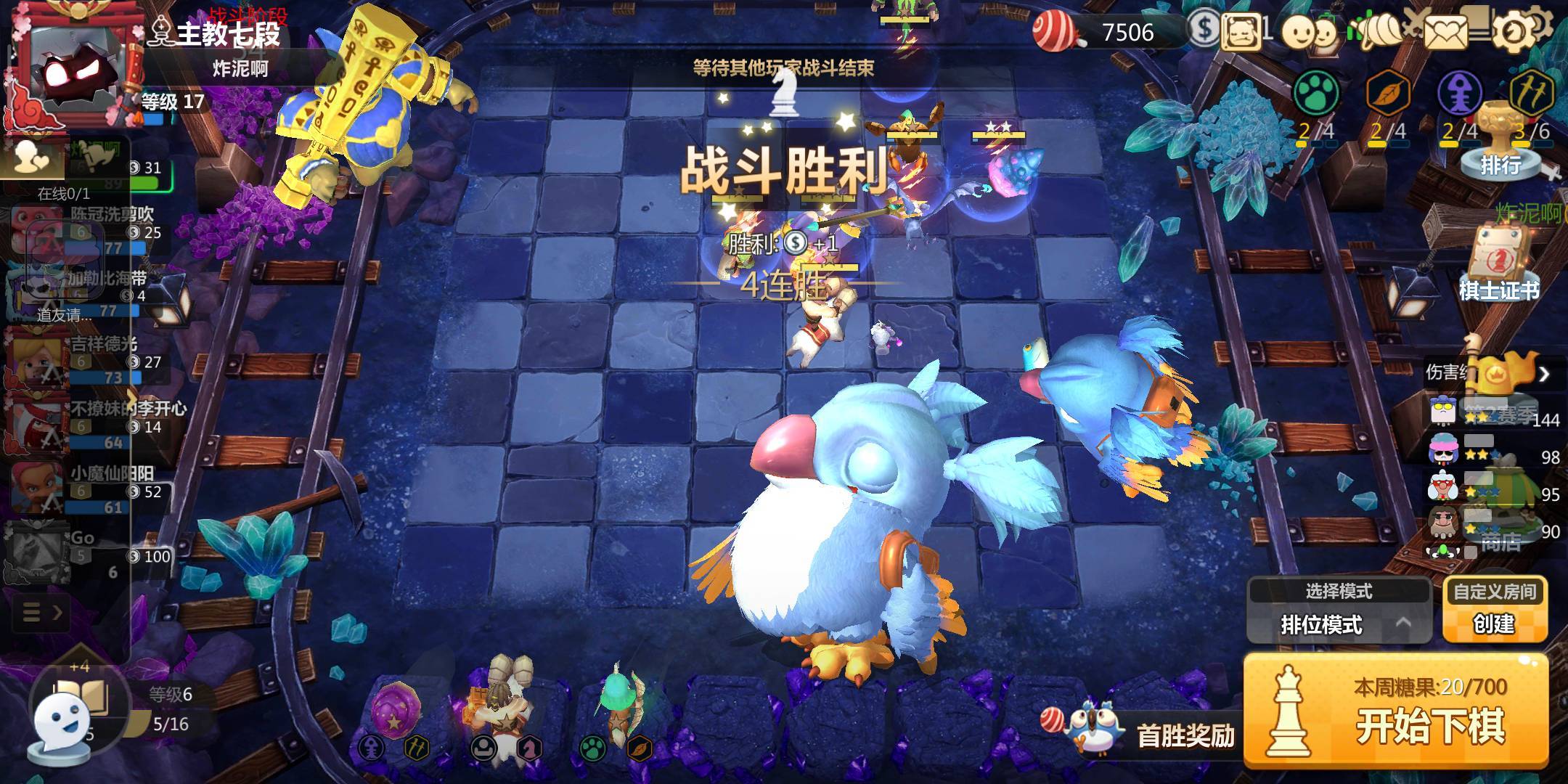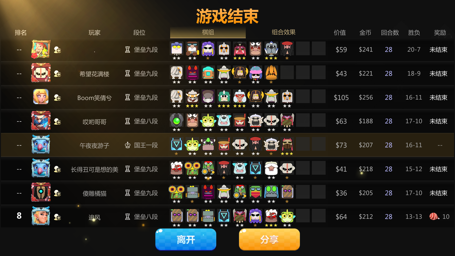 打概率吃鸡的阵容,主场还没打完,直接跳转到结算界面,按照第三名计算奖励了???这个图很明显了吧,我第三,目前第一第二第四还没结算。哭