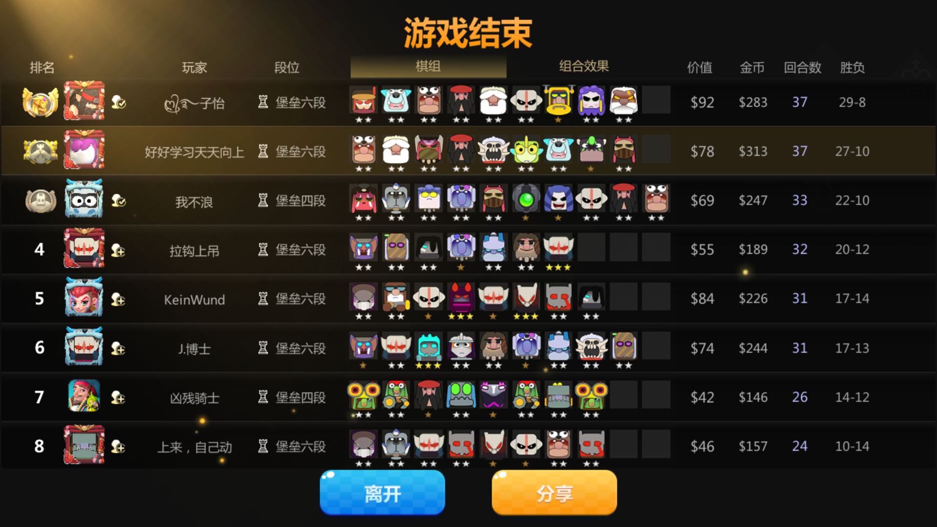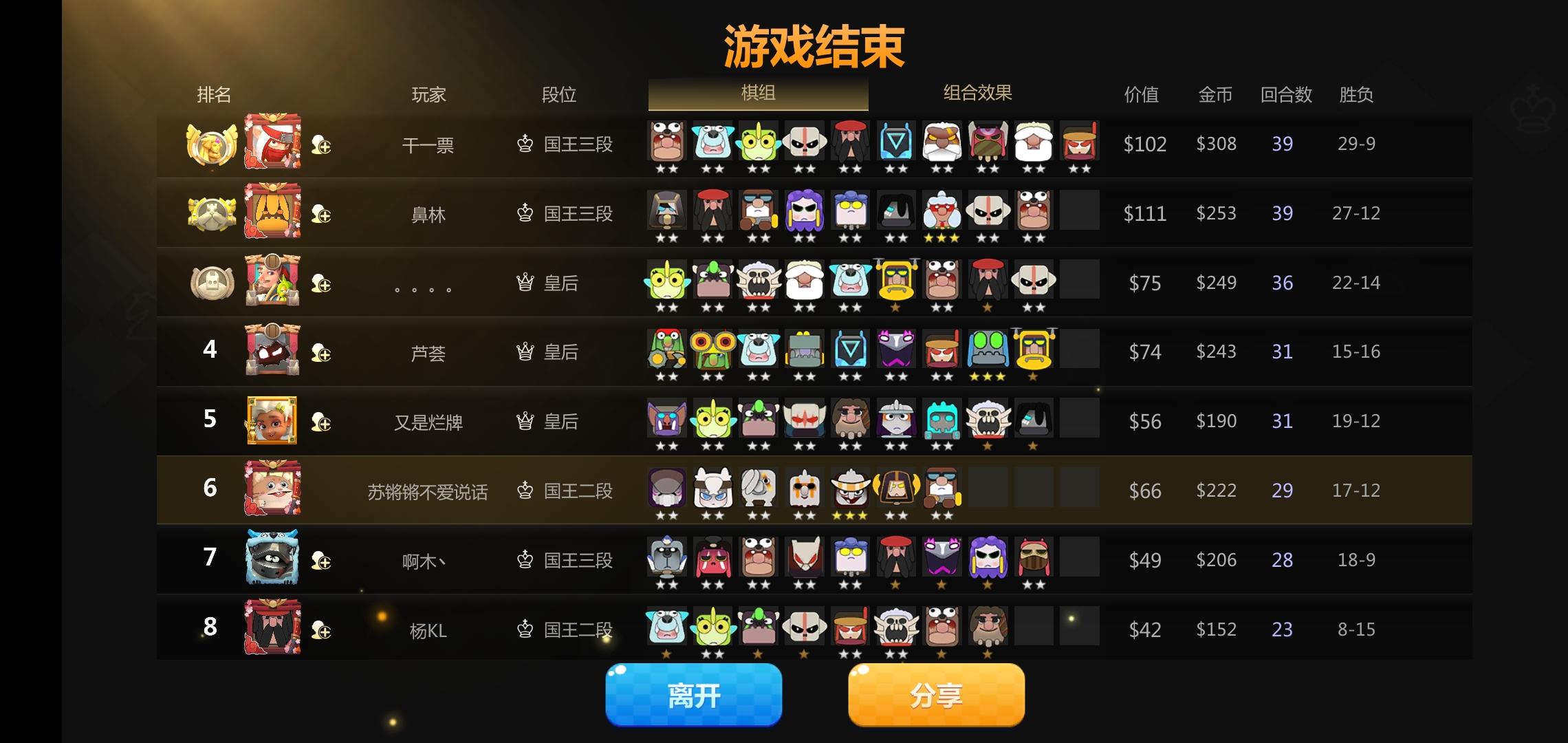 在明明我已经要稳赢了,然后看到已经出局的朋友在说卡了,我不知道说谁。我玩的是刺客,我的ta都两星了,女王也已经下了换pa,然后打完野怪后突然结算了,我第二,我的ta还是一星,女王还在场上。气死咯。