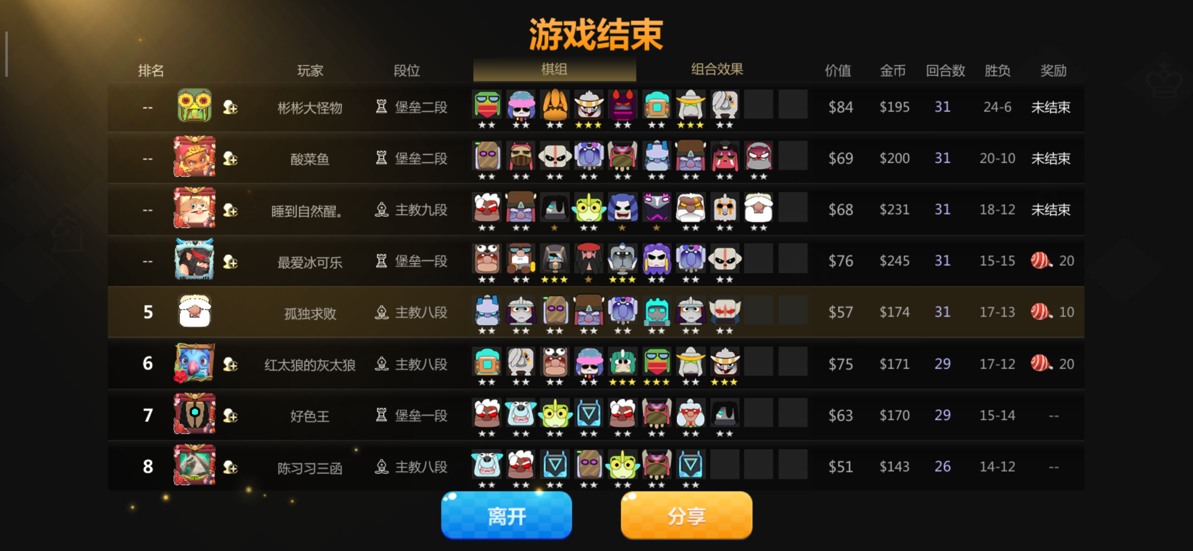 没得录屏,最后连续4把打死对面,把把我剩两个棋,我10滴血,对面两滴,一直不死。最后打不过大龙,我被反杀了。