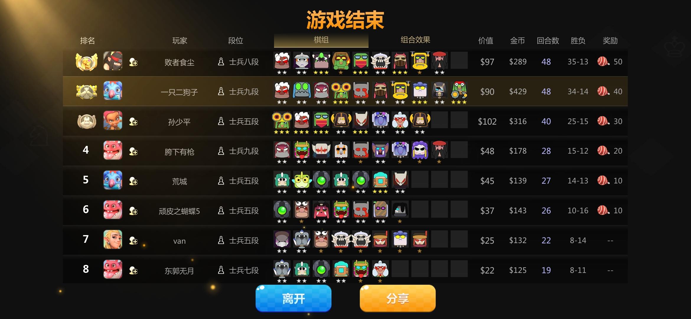 好不容易看懂精英战是什么并吃鸡然后就两局32回合没有船长????全局8个人只有一个一星船长,玩个G8!再一局,没有船长直接卸载了。