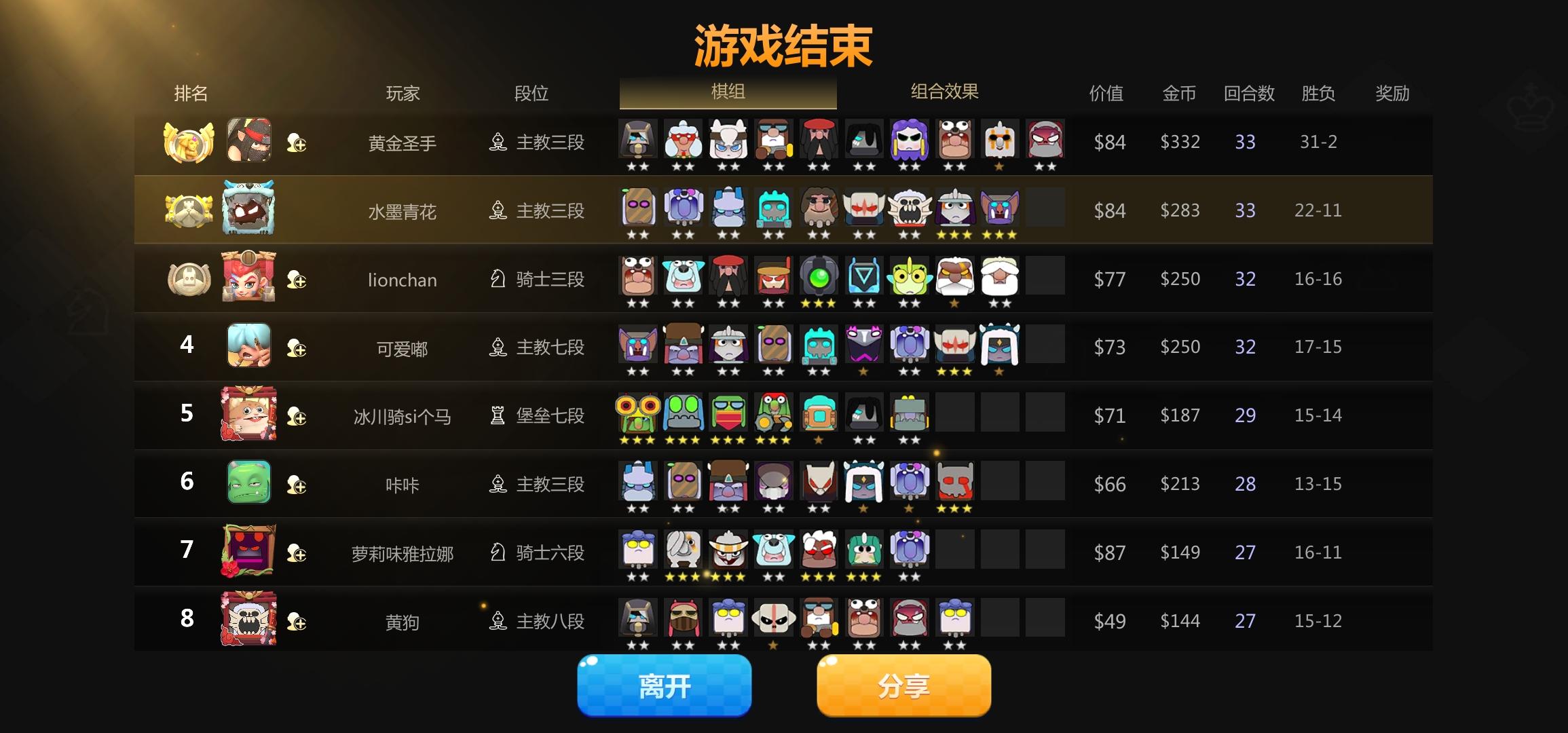 第一名开挂,7人口6个二星,组合是二野兽三射手二亡灵,我八人口五骑士四冰川居然打不过。关键是一个都打不死,我前排骑士顶着百分比减伤瞬间就死。他六人口的时候更离谱,就是二野兽三射手,还两个一星的,有个人出三星地精刺客,三地精组合五人口没打赢。