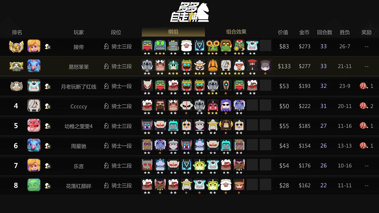我就搞不懂有时候吧我第四还加那么一分零分,你说我能拖到第四就很好了,到三十四五回和了就差的不多,就一个先后问题了,血量都是一波没,我第四怎么就加一分?能在游戏界面说明细下各各段位加分详细规则吗,说一下我国王段位,第五我还有时候加一两分,扣四五分,第四我就玩过加七分也有不加分的,我第四一般都不会很早,都在三十回个以上,,嗯嗯,还是希望有一个明确的加分方式公布,比如说国王段位第四名在三十到三十五回合加
