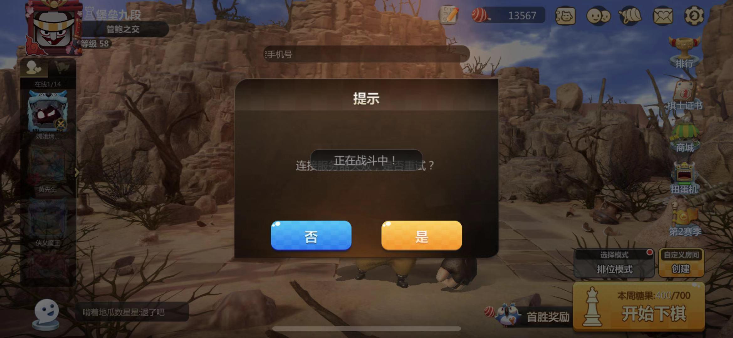 杀掉游戏后重进,依旧是这个提示,过若干分钟后可以点匹配,然后又回到这个状态,死循环手机: iphoneX操作系统: iOS 12.4网络: wifi运营商: 电信地区: 上海