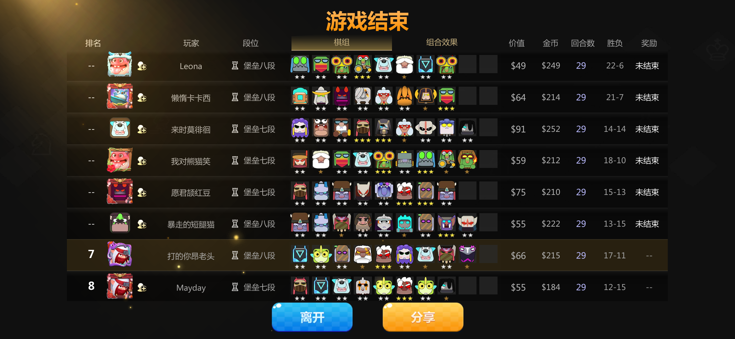 堡垒7快一星期了,把把都是拿什么不来什么。但是每次快掉段的时候,就来一把天胡。今天遇到个有趣的事,连续3把碰到同一个人,第一把碰到他,他第一我第6,第二把又碰到他,牌太垃圾我直接15了,他还是第一。我15后直接开第三把,巧了,又是他。然后他又是第一。我这段位也不高啊,这游戏已经人少到低段位都需要电脑人了?