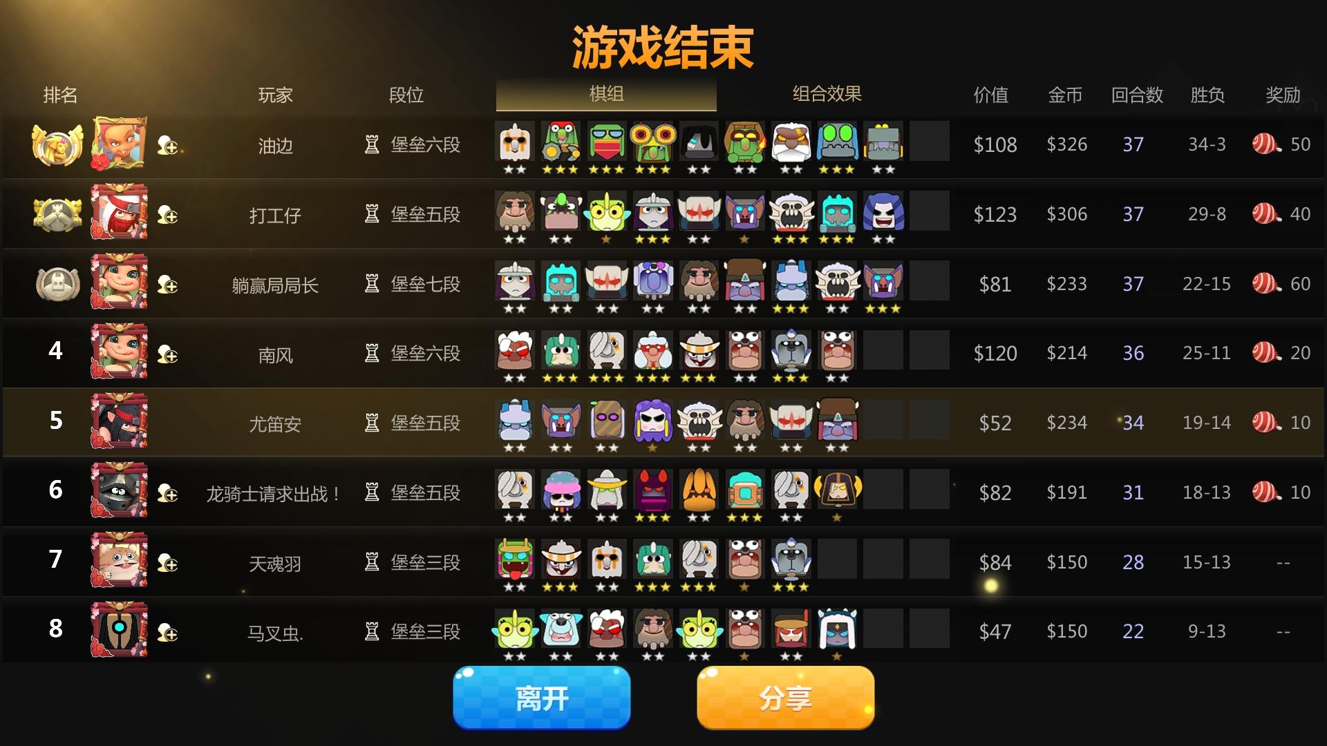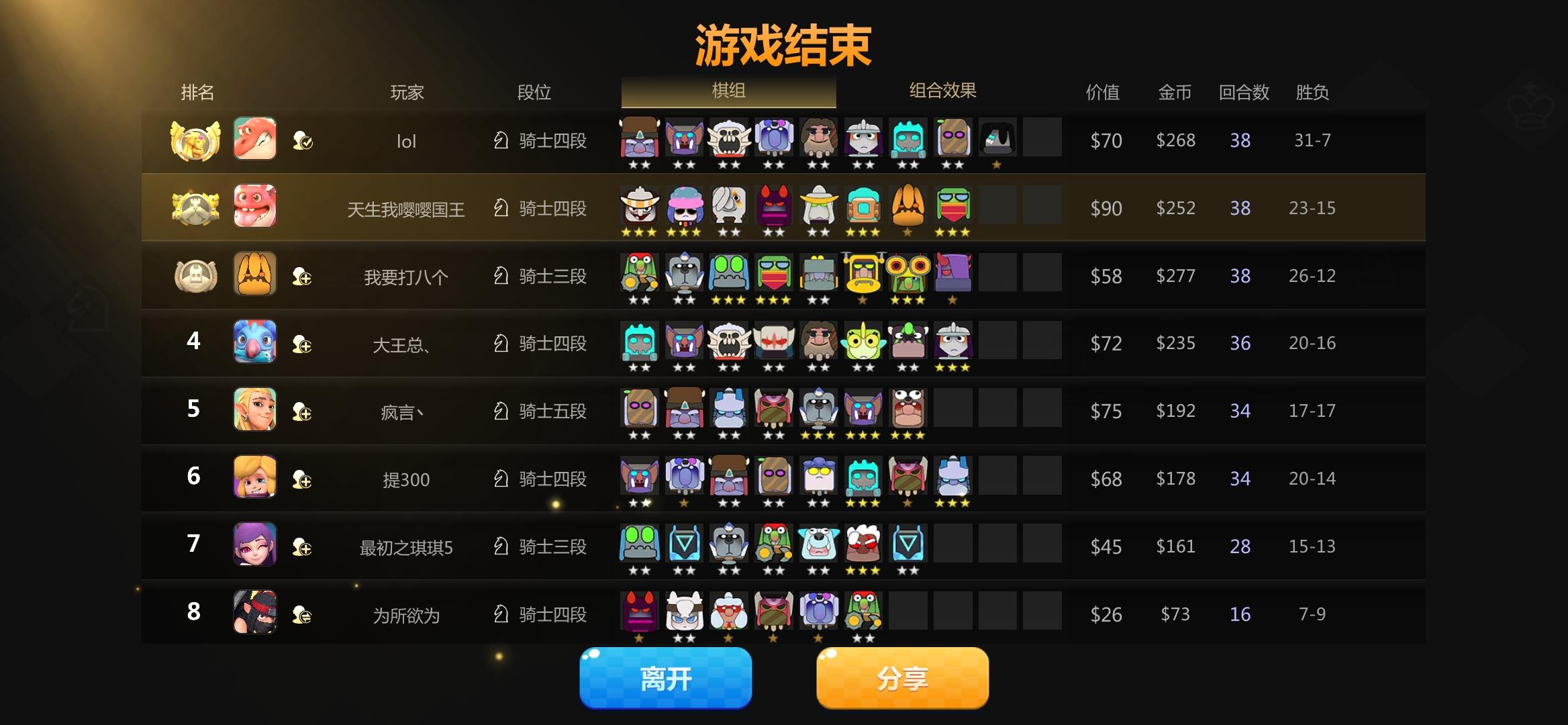 游戏是突然结束的,所以游戏内我没有截图。结束前我排名第二,剩下四个人结算时我拿个第五,心态崩了
