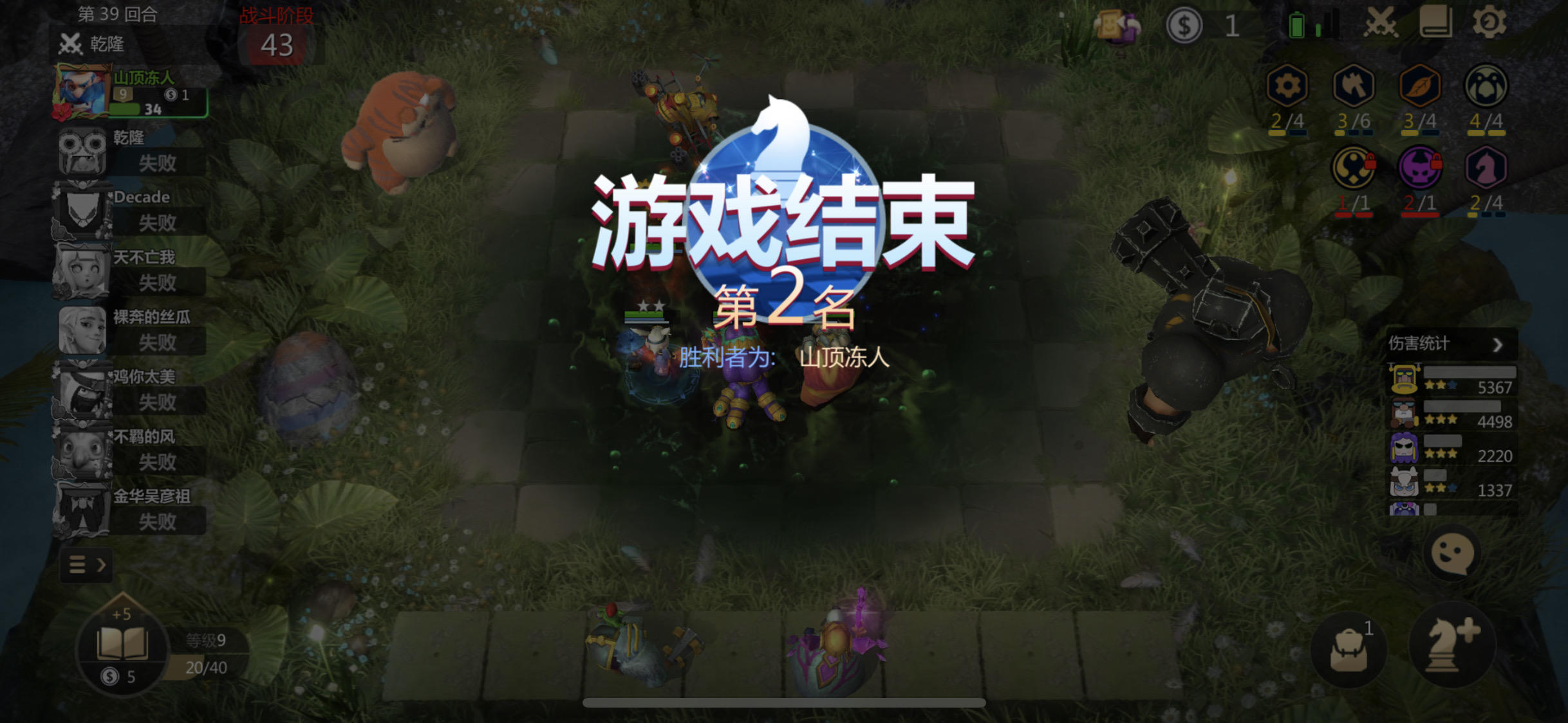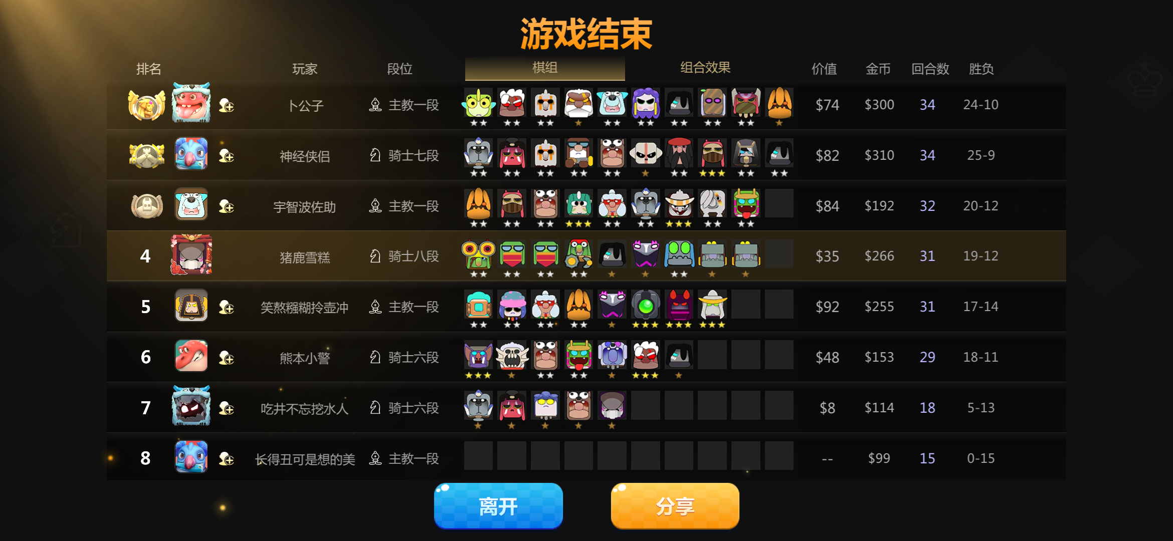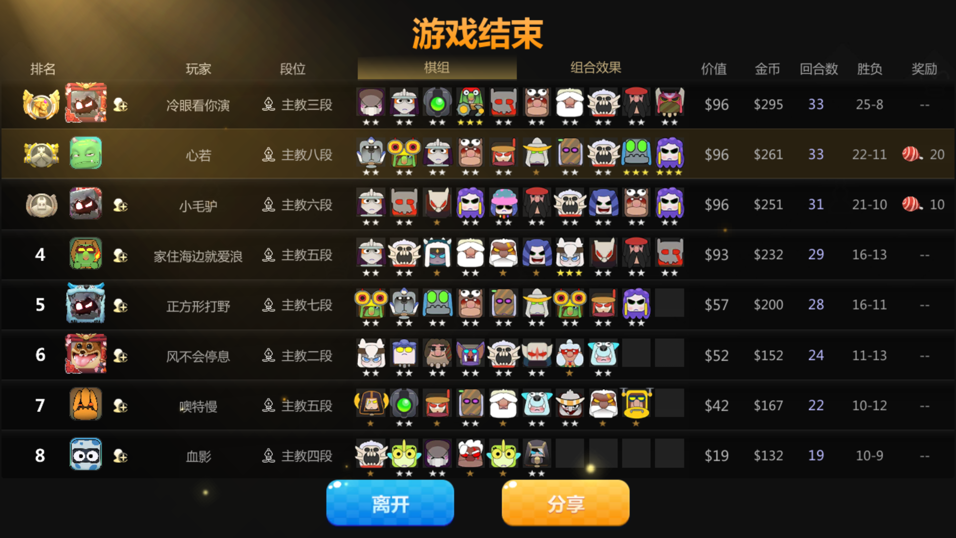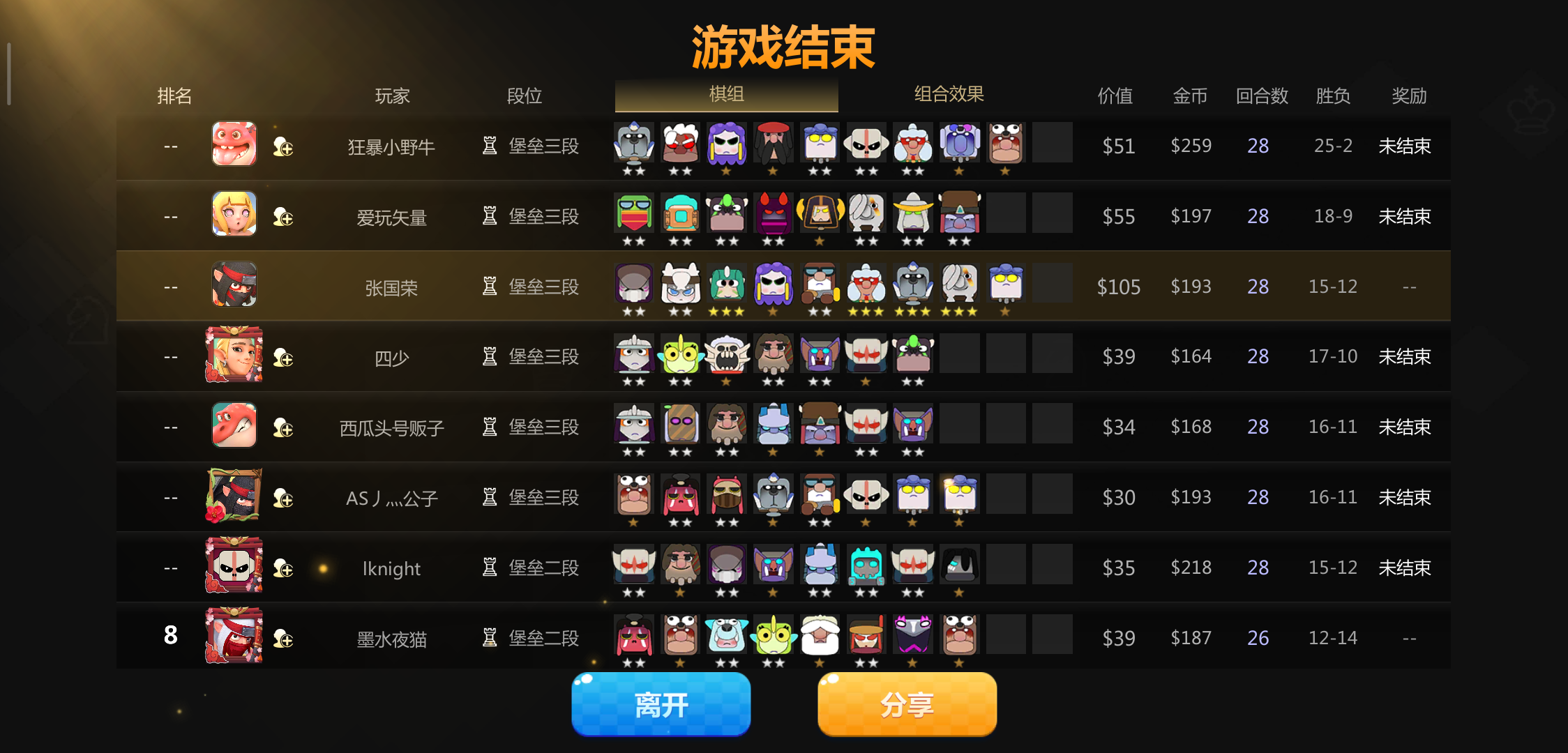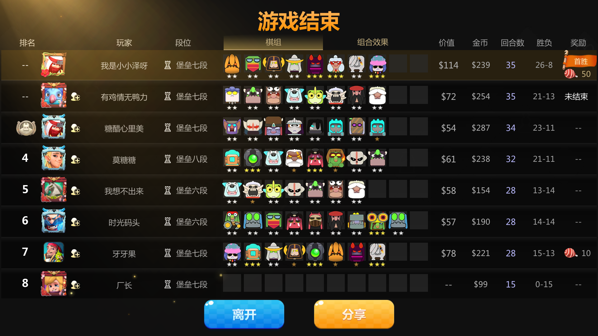 这把我刚六地精,萃取者用蛋合成二星,科比是早已经三星了,然后刚拿到炸弹人打了一回合就突然结算,然后退到等待界面