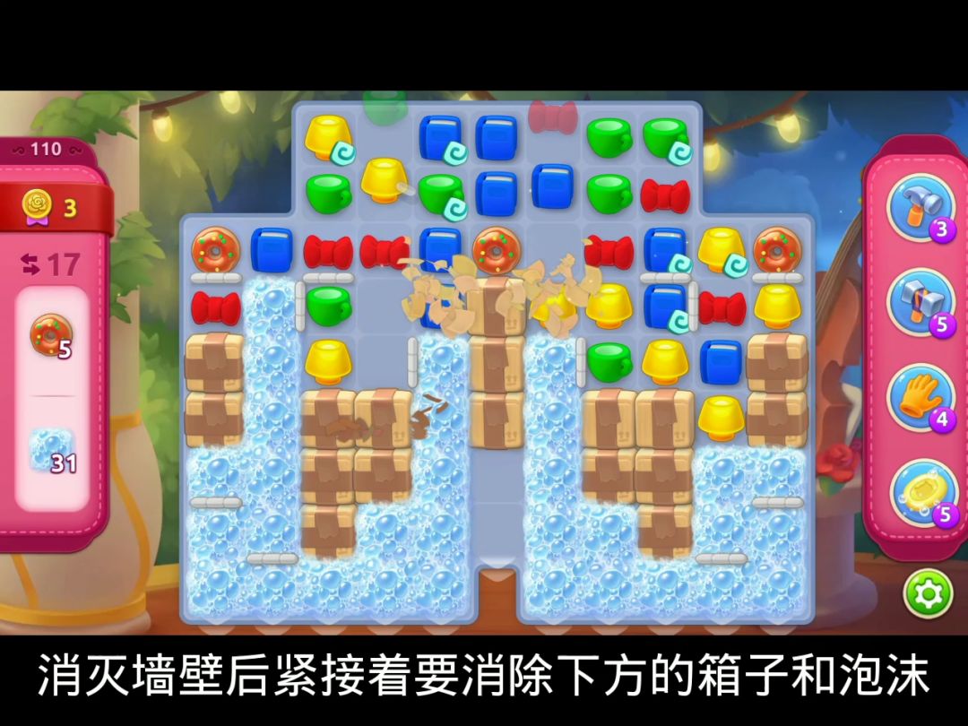 【关卡介绍】关卡目标:甜甜圈×5,泡沫×30关卡步数:23步关卡障碍物: 墙壁(可消除),箱子关卡难度:超高难度【关卡攻略】先上原图,仔细观察,然后分析局面。 通过观察,本关必须消掉墙壁和箱子才能让甜甜圈掉落下来。局面中已有3个甜甜圈,还有两个甜甜圈没出现,通过闯关几次后发现,只有局面中的两个甜甜圈掉落,才会出现第四个甜甜圈,掉落第三个甜甜圈后,才会出现第五个甜甜圈,所以首要任务是先
