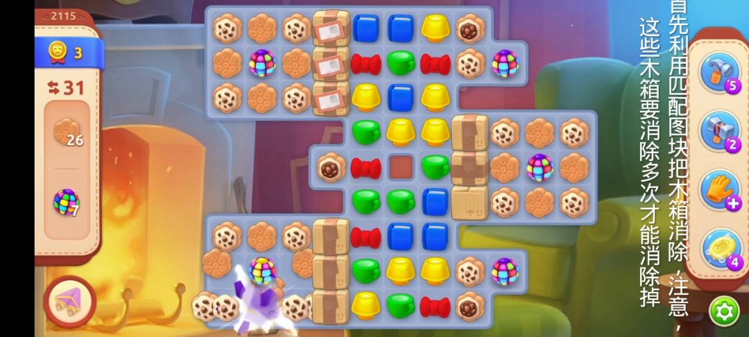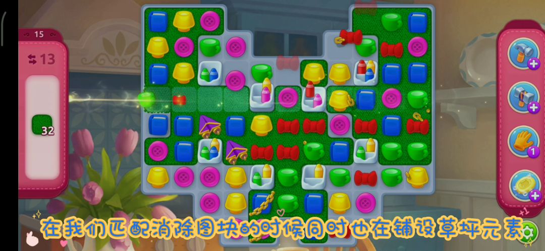 关卡:黄金杯第15关 目标:草坪×55 步数:22步 其他元素:锁链,草坪,蜡笔盒 难度:超高难度