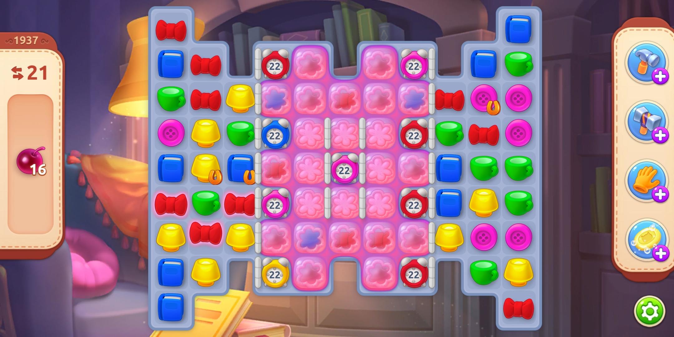 大家中午好,我是你们的幸福生活,是不是很期待我的出现呢?我好想你们呀!!!今天咱们就真对1937关卡做一下深度讲解。【障碍物】墙壁,果冻,闹钟【过关要求】16个苹果【过关步数】21【难度系数】普通关卡【游戏介绍】本关难度就在于果冻下面的苹果难以收集,果冻太厚了需要一层一层的打开,而且还有松动的墙壁需要清理掉才能收集中间部分的苹果呦,还有闹钟限制(在闹钟倒计时到0之前一定要把闹钟消除掉不然