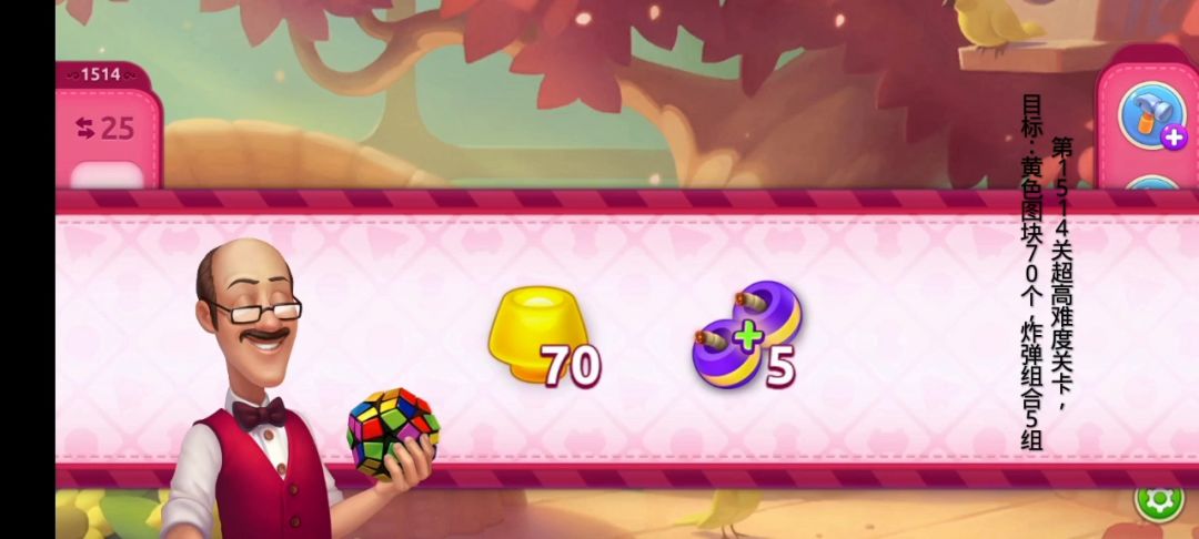 关卡目标:黄色的图块70个,炸弹组合5组关卡难度:超高难度关卡步数:25关卡障碍物:花藤、冰冻攻略截图可以看出,花藤把炸弹都包围在里面,要想炸弹组合在一起,首先要消除掉花藤,利用花藤旁边的元素,消除花藤上面的一整朵花,就可以全部消除掉一整根花藤。这里要注意一下,很多小伙伴看到有炸弹,就会想着利用炸弹来炸开花藤,小伙伴们,千万不要做这样的选择,上面有6个炸弹全部引爆,花藤不仅不能全部消除