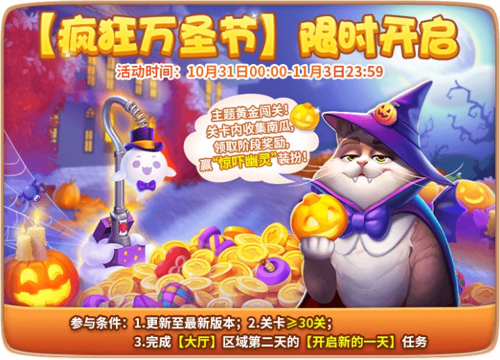 今天是十月的最后一天咯多亏了小主人的努力通关家园变得越来越繁华美丽~十一月~家园已经做好准备等待大家啦!一起看看第一周有什么有意思的活动吧听说有万圣节节日装扮哟,期待一手~10月31日:黄金闯关-疯狂万圣节、家族互助、扶摇直上11月1日:万圣节登录有礼、黄金闯关-疯狂万圣节、首通三倍星星、关卡更新至8920、家族互助、扶摇直上11月2日:黄金闯关-疯狂万圣节、赛季积分双倍、家族互助