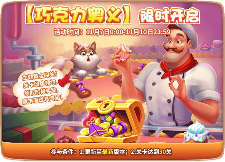 金色满园皮肤开启好几天啦快告诉秃秃大家的进度如何~没完成也不要紧,这周接着冲!还有奇幻赛季送来道具助你轻松通关除此之外,本周还有黄金闯关返场提前预祝各位小主人玩得开心~11月7日:黄金闯关-巧克力奥义、家族互助、扶摇直上11月8日:黄金闯关-巧克力奥义、双倍金币(三点到五点)、关卡更新至8950、家族互助、扶摇直上11月9日:黄金闯关-巧克力奥义、赛季积分双倍、双倍金币(三点到五点